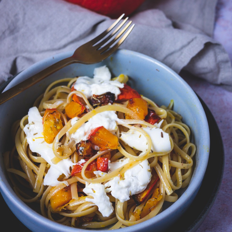 Karamellisierte Ofenkürbis Pasta mit Burrata