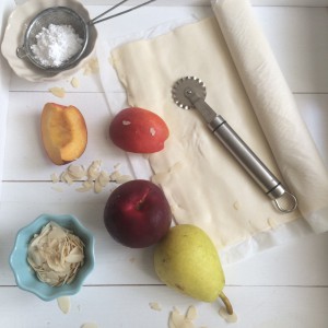 Den unteren Teil des Teigs hochklappen, sodass das Obst eingepackt ist und ein paar Mandel darüber streuen. Ihr könnt die Mandeln aber auch schon auf die Marmelade geben, so wie ihr mögt.