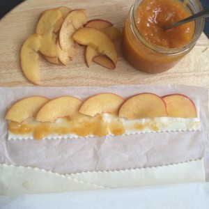 Dann nehmt ihr euch einen Teigstreifen und legt den Rest beiseite, damit ihr mehr Platz habt. Auf dem ganzen Teigstreifen verteilt ihr etwas Marmelade; vielleicht hat eure Mama ja auch noch selbstgemachte 🙂 Auf die obere Häfte kommen nebeneinander ein paar von den Obstscheiben. Ich habe bei einigen Blumen nur Nektarine oder nur Birne genommen, bei anderen beides abwechselnd. Dabei darauf achten, dass die Obstscheiben nur leicht über den Rand gehen. Ich habe die Erfahrung gemacht, dass die Scheiben sonst beim Aufrollen alle wieder rausfallen.