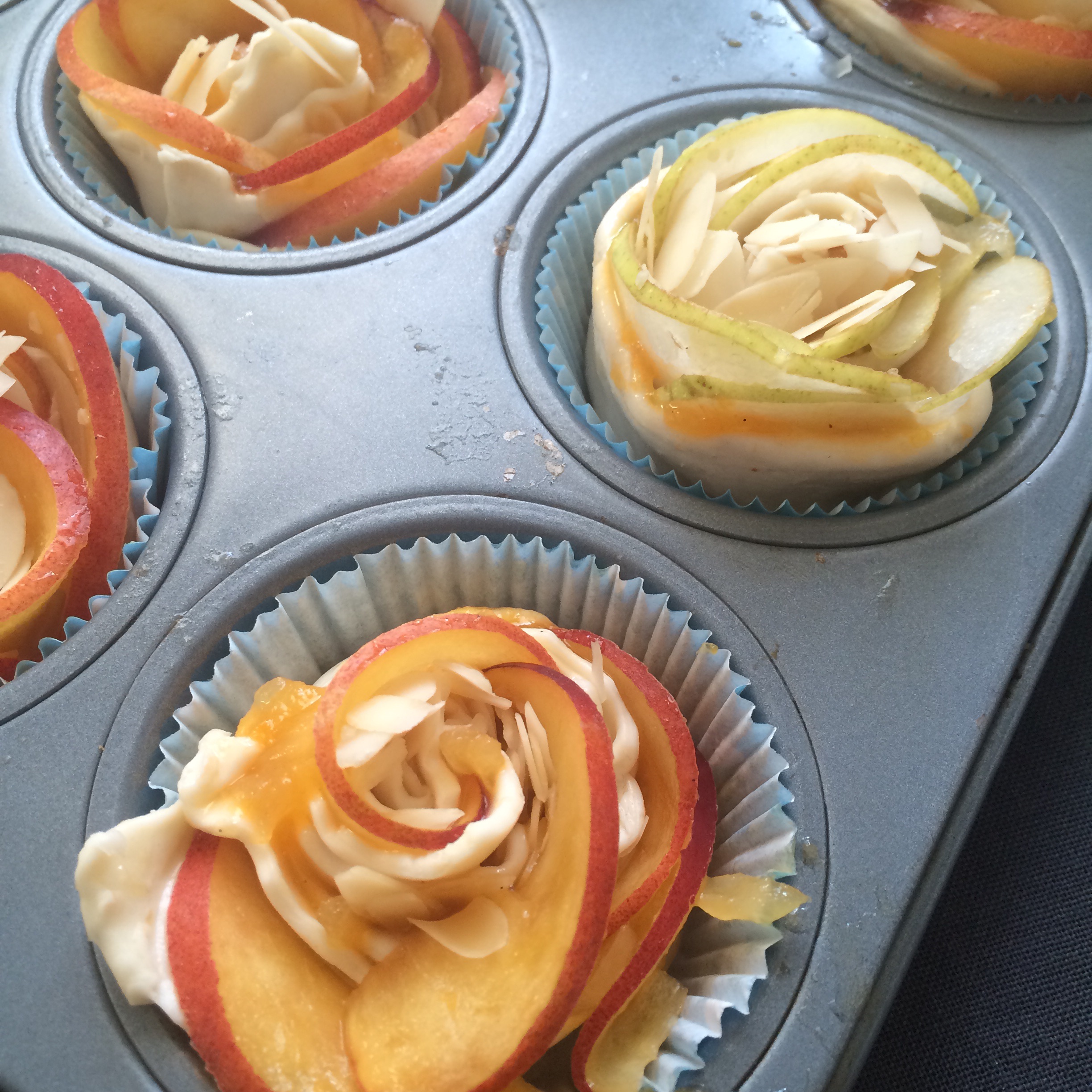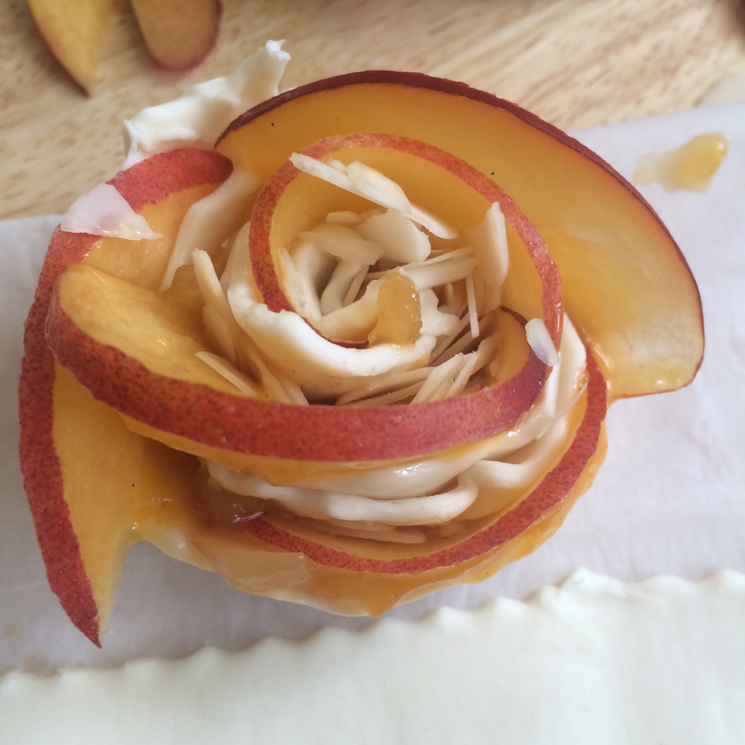Jetzt kommt die kleine Herausforderung: das Aufrollen. Am Besten legt ihr den Teigstreifen hochkant vor euch und rollt vorsichtig hoch. Bei mir hat es auch nicht auf Anhieb geklappt und die erste Blume war… naja, wie sag ich das nett… bisschen hässlich und krumm. Aber nach und nach ging es immer besser. Also nicht entmutigen lassen, falls es nicht auf Anhieb gut klappt. Aber es ist schon etwas einfacher, wenn die Obstscheiben dünn geschnitten sind. Wenn die Scheiben dicker sind, sieht es dann so aus: