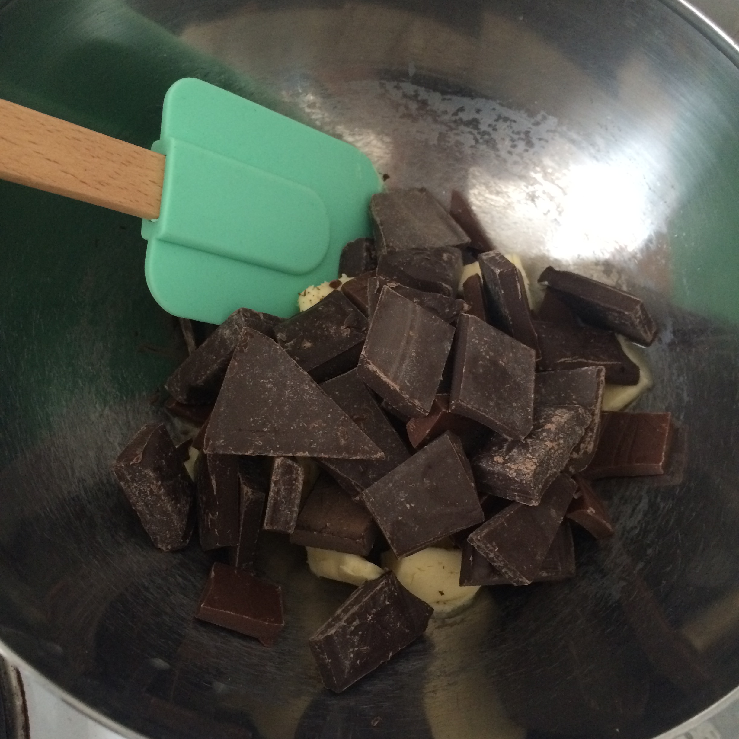 Die Schokolade zerbrecht ihr in kleine Stückchen und schmelzt sie gemeinsam mit der Butter in einer hitzebeständigen Schüssel über einem Wasserbad (oder ganz vorsichtig auf niedrigster Stufe in der Mikrowelle) und rührt um, bis sich eine warme Schokoladenmasse ergibt. Bitte nicht richtig aufkochen lassen, nur erwärmen, damit Butter und Schokolade schmelzen!