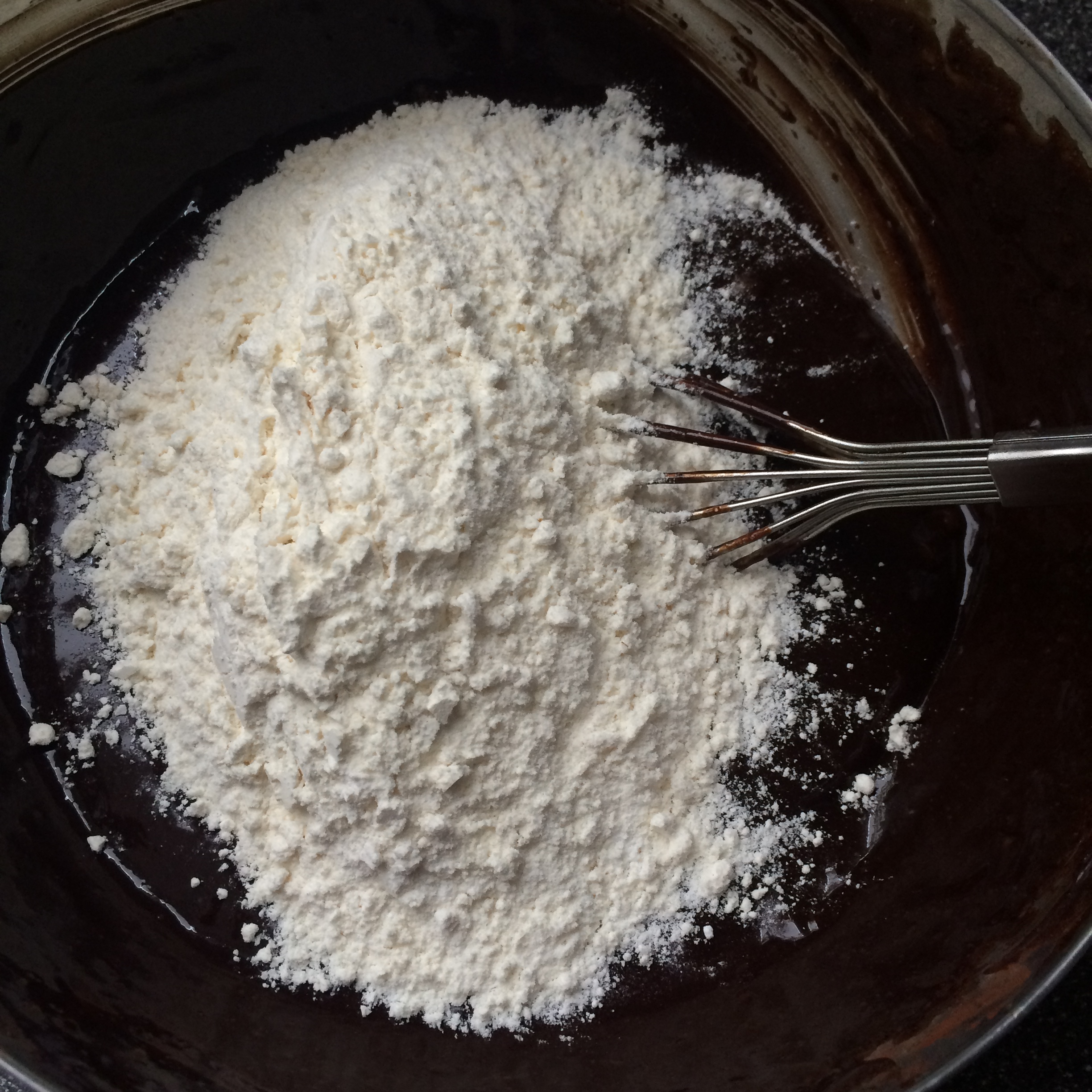 Danach werden vorsichtig Kakaopulver und Mehl mit Backpulver und der Prise Salz untergerührt.