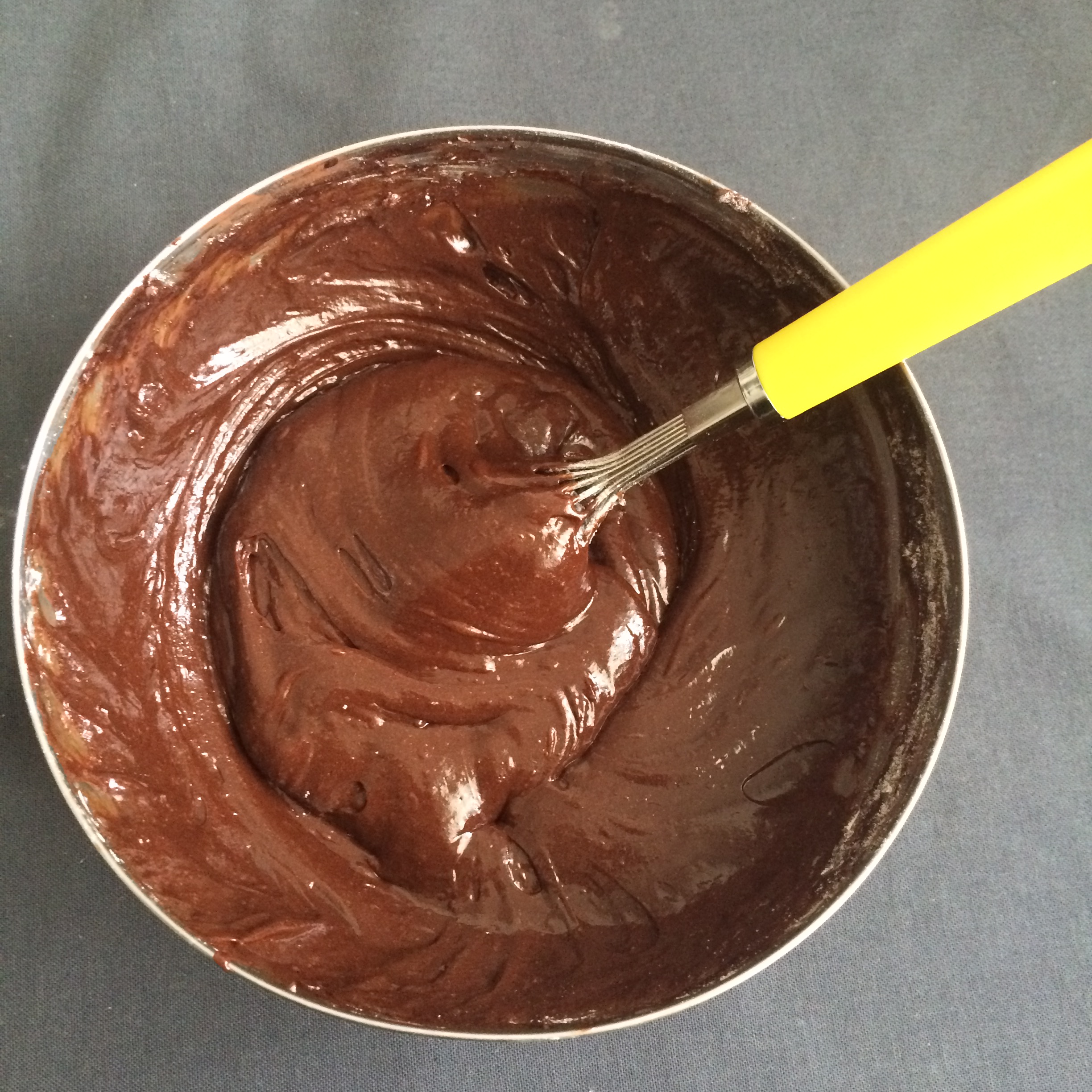 Zu der Schokoladenmischung wird nun der Zucker untergerührt und dann nacheinander je ein Ei mit dem Schneebesen untergequirlt.