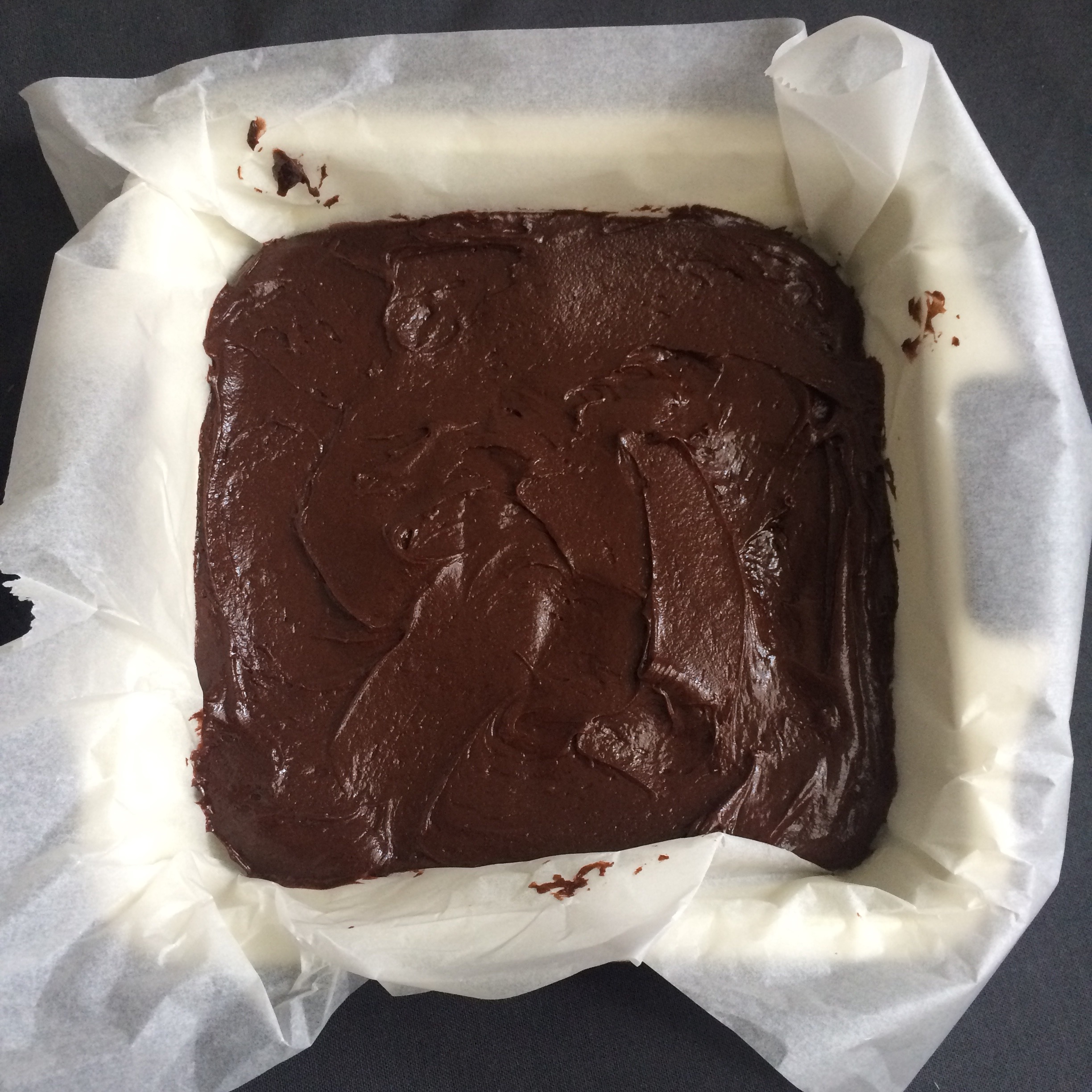 In eine gefettete Brownieform (viereckig und höherer Rand) packe ich dann ein Blatt Backpapier, damit ich später den ganzen Kuchen einfach aus der Form hochheben kann. Dann kommt der ganze Teig rein und wird mit einem Spachtel ein bisschen glattgestrichen.
