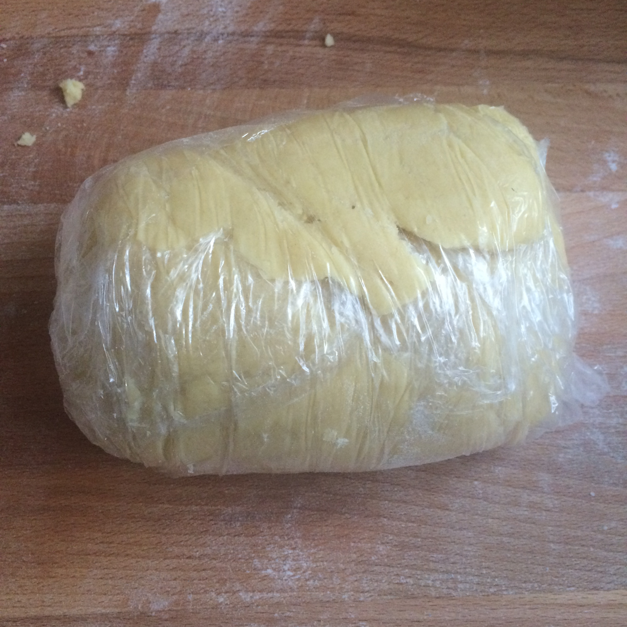 Nach und nach mischt ihr dann das Mehl mit dem Salz unter die Buttermischung bis sich alles zu einem Teig verbunden habt. Diesen verpackt ihr dann in Frischhaltefolie und lasst ihn mindestens 1-2 Stunden im Kühlschrank, damit er hart genug ist, um ihn ausrollen zu können.
