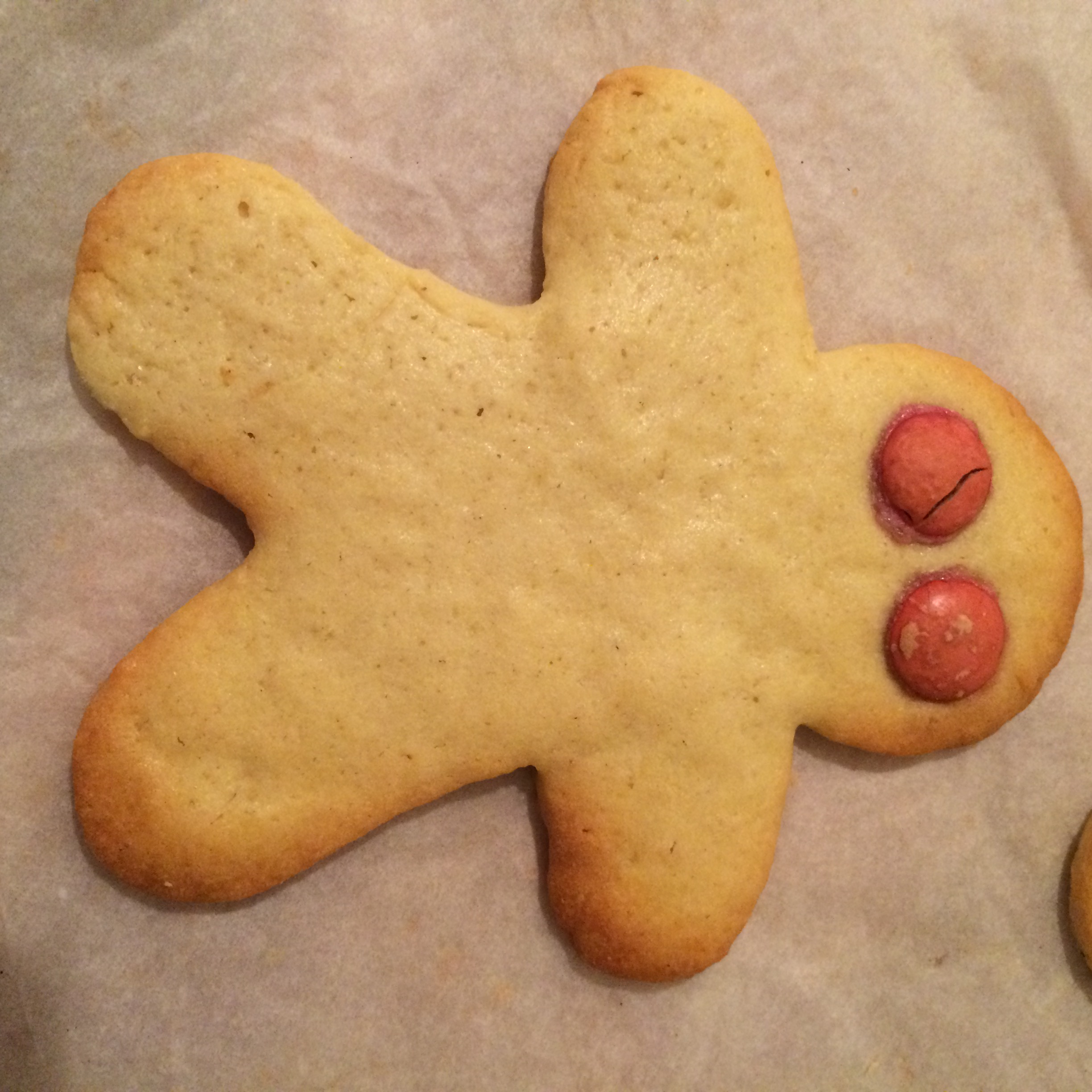 Jetzt könnt ihr nach Lust und Laune ausstechen. Ich hatte eine Herzform und Lebkuchenmännchen in mehreren Größen. Bei den großen Lebkuchenmännchen habe ich bereits vor dem Backen Smarties als Augen eingedrückt. Die Farbe verliert sich ein bisschen und verläuft, was einen schönen Effekt hat. Manche Herz habe ich vor dem Backen zerschnitten.