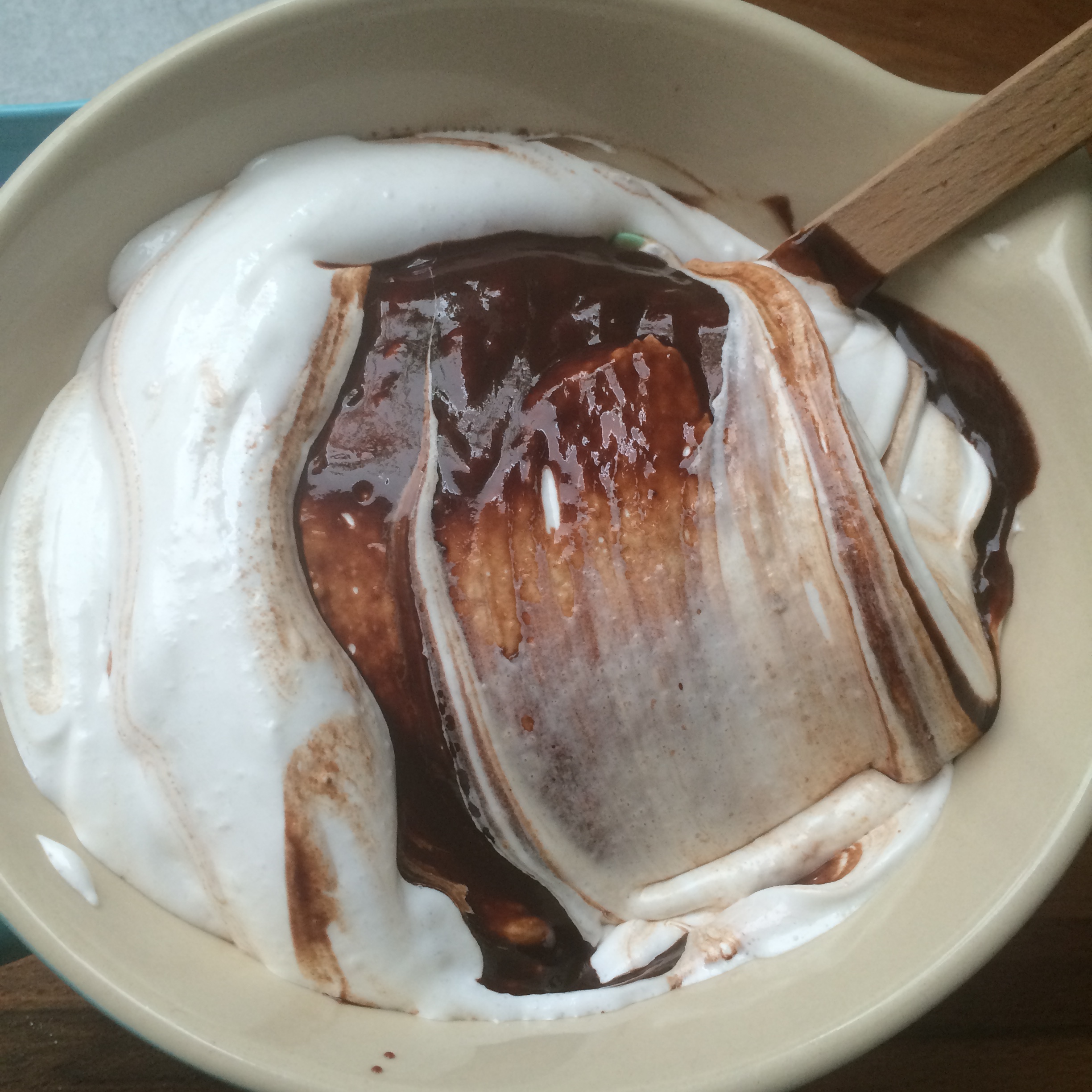 Die Espressomischung rührt ihr dann unter die Schokoladenmasse und hebt dann vorsichtig den Eischnee unter.