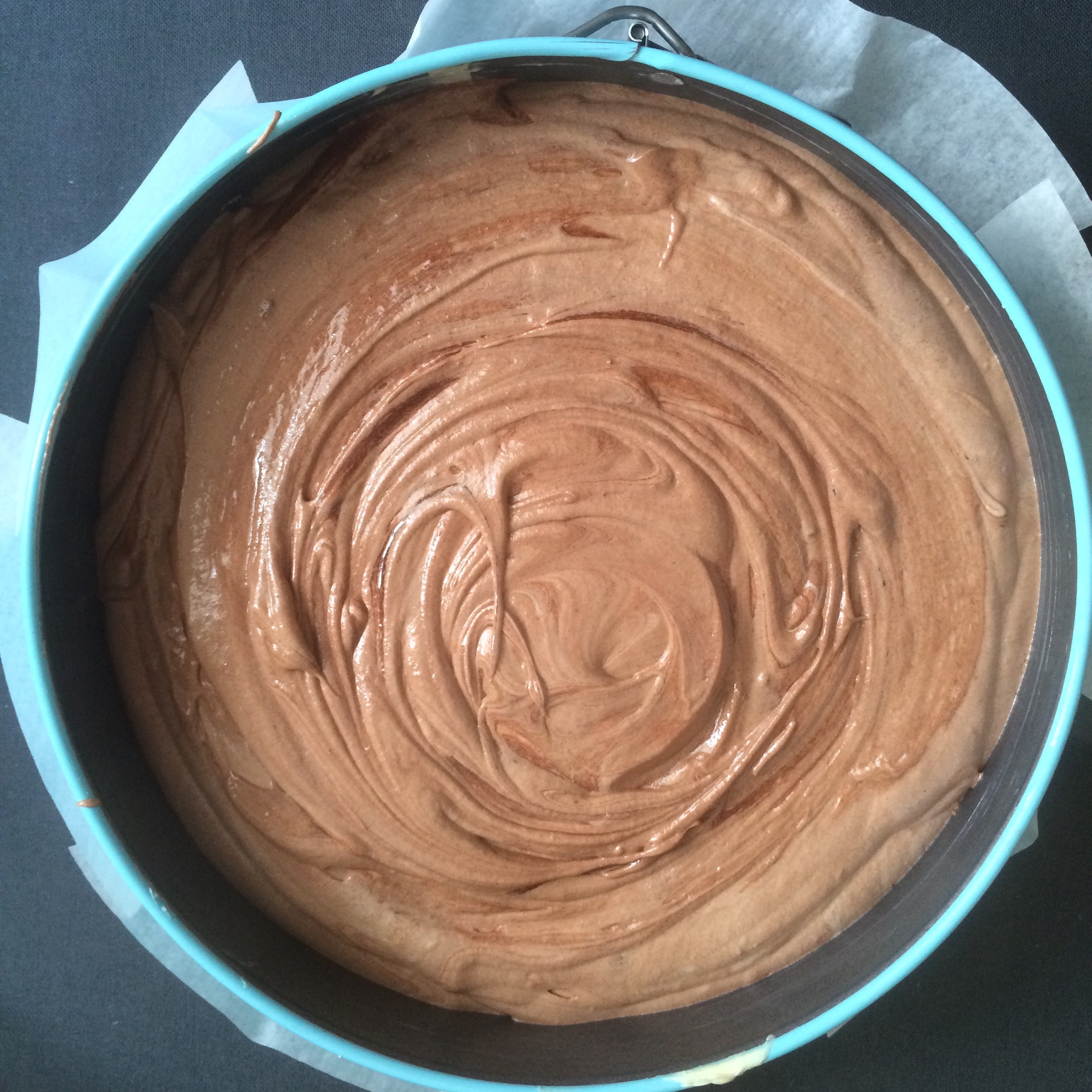 Jetzt sieht es schon echt lecker und fluffig aus. Die schokoladige Masse verteilt ihr dann in einer großen mit Backpapier ausgelegten Springform (Durchmesser 26 cm) und fettet die Seiten mit Butter ein.