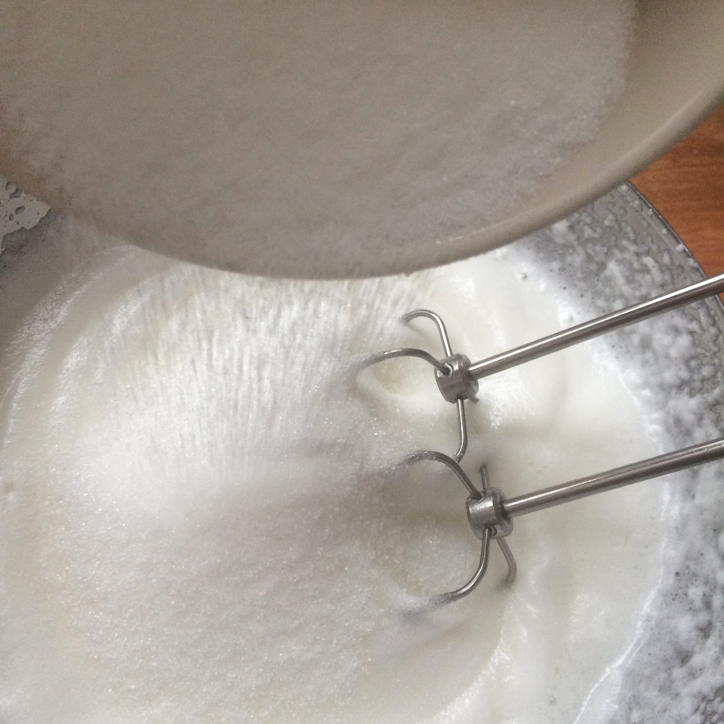 (Kleine Anmerkung: Ihr könnt auch nur die Hälfte des Zuckers dazu geben, und die andere Hälfte später mit dem Eigelb schaumig schlagen. Ich mache es mal so, mal so. Je nachdem, ob ich daran denke, nicht den ganzen Zucker direkt zum Eiweiß zu geben :D)
