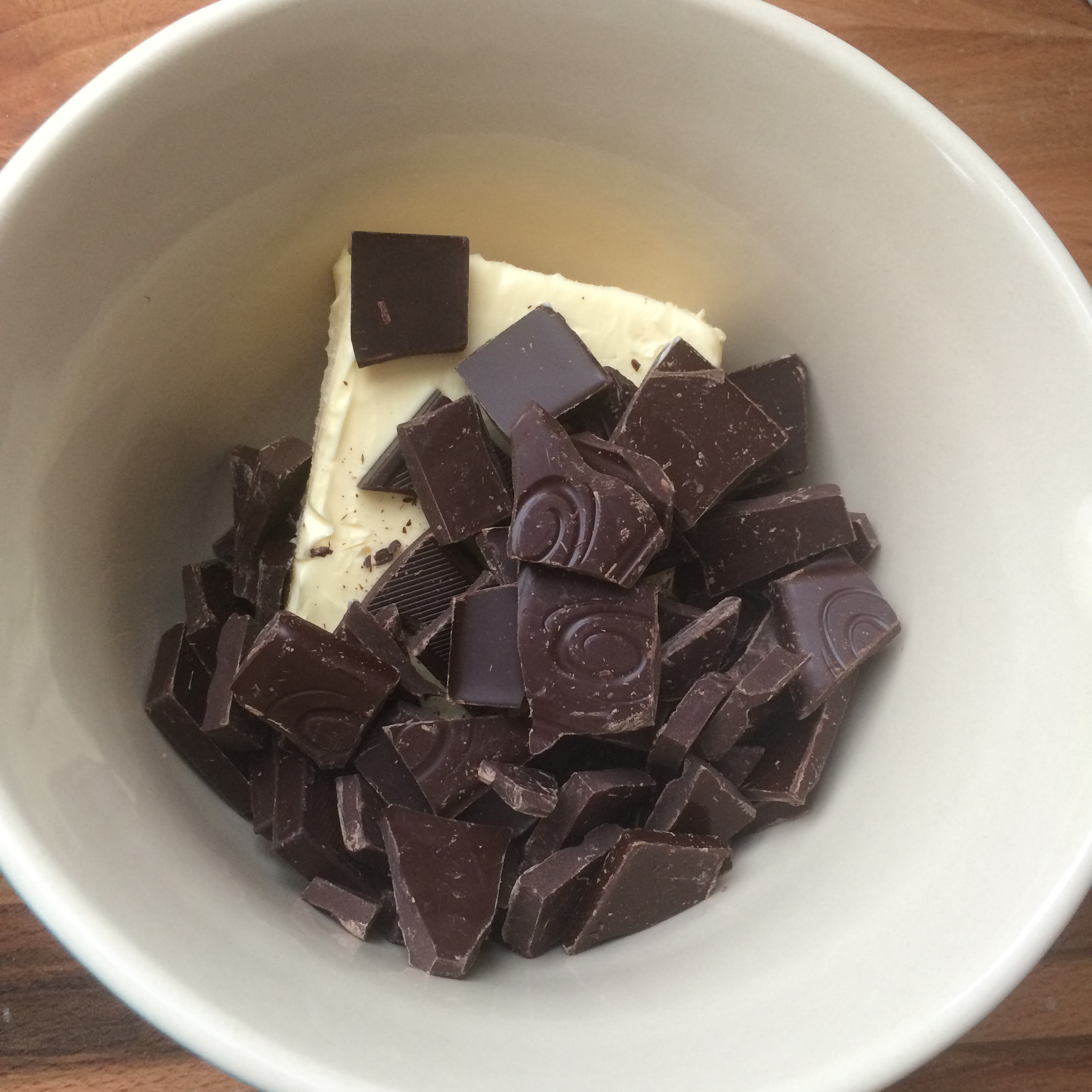 Als Erstes hackt ihr die Schokolade in grobe Stücke und schmelzt sie zusammen mit der Butter, entweder bei 300 Watt für knapp 2 Minuten in der Mikrowelle oder über einem Wasserbad.