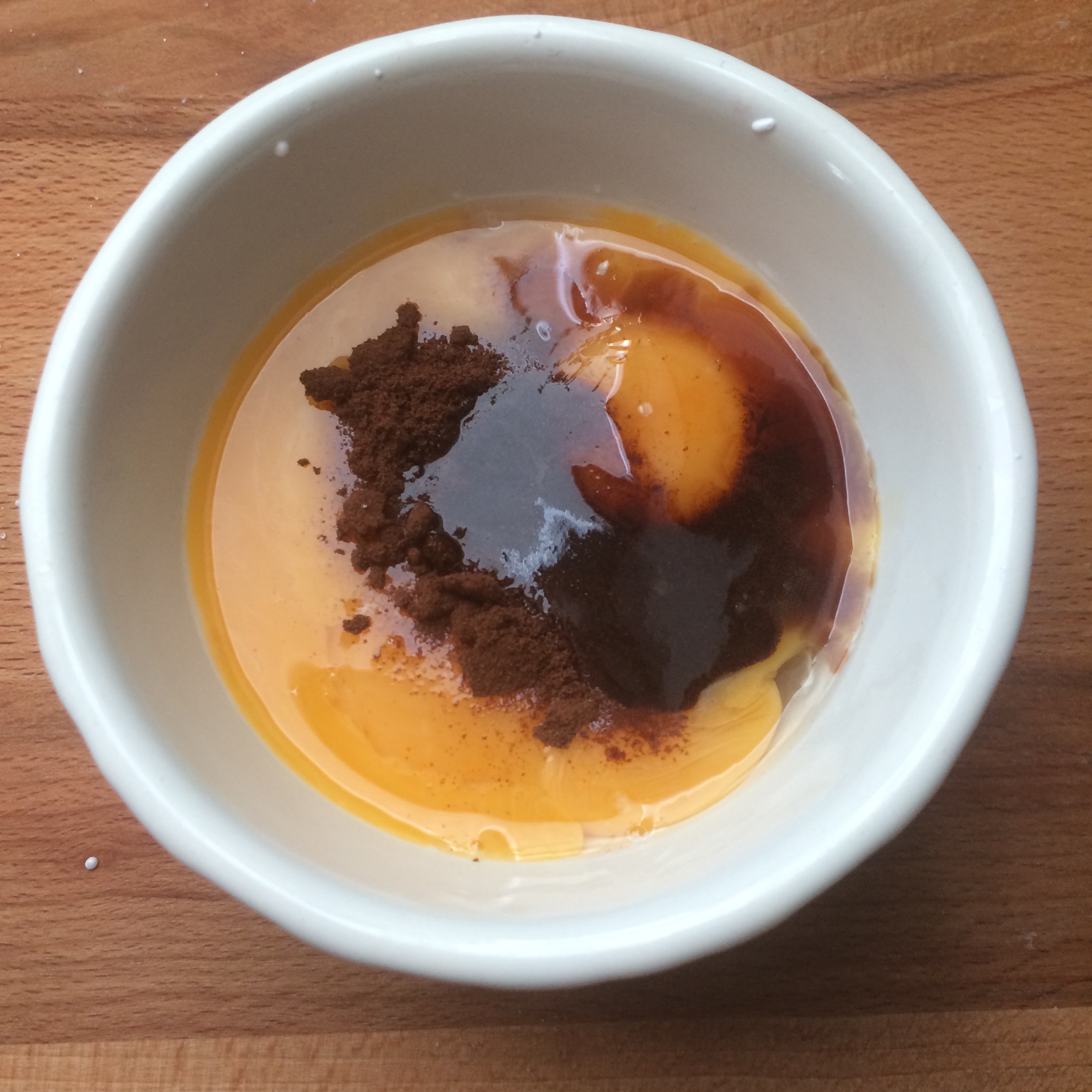 Je nachdem für welche Variante ihr euch entschieden habt, mischt ihr nun das Eigelb mit dem Zucker und Vanilleextrakt plus Espressopulver (ich habe dieses Mal schon den kompletten Zucker in das Eiweiß gegeben) und verquirlt es gut bzw. schlagt es mit dem Zucker schaumig.