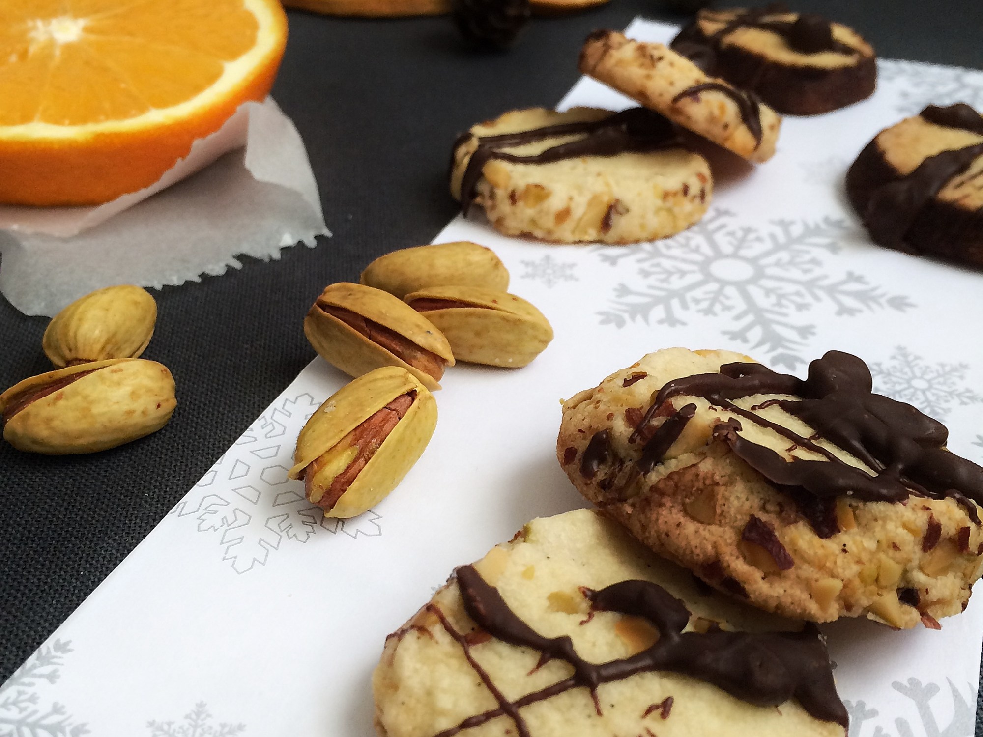 Nachdem die Plätzchen ausgekühlt sind, schmelzt die Schokolade und verziert die Kekse ganz nach eurem Geschmack. Lecker ist auch, wenn ihr noch ein paar von den gehackten Pistazien in die Schokolade gebt, bevor ihr die Kekse damit verziert.