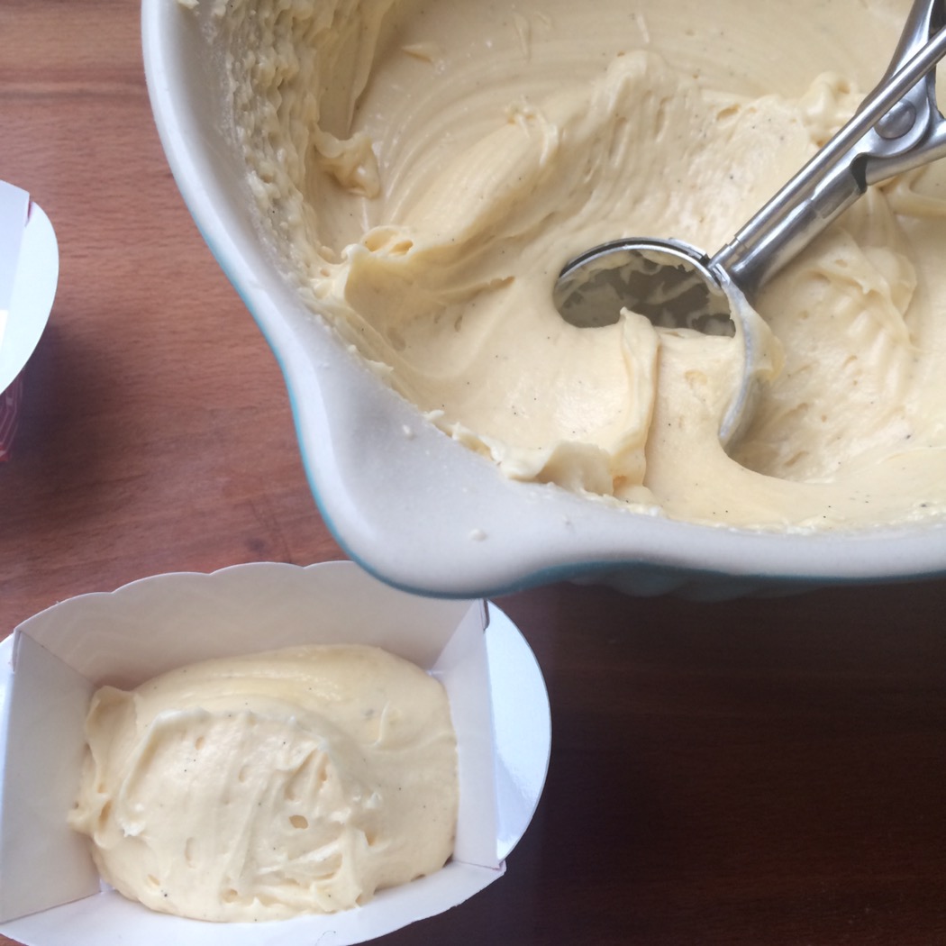 Ich fand es am einfachsten, ihn mit einem Eisportionierer in die Förmchen zu packen. Bei Muffins ist das immer knapp eine Kugel Teig. Je nach Größe der Form etwas mehr…