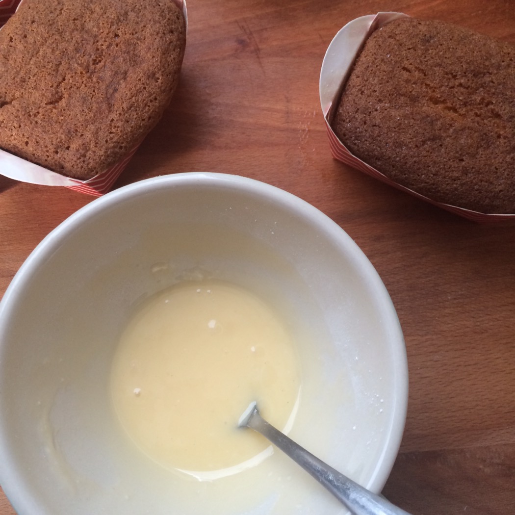 Nach dem Abkühlen und dem ausgiebigen Lachkrampf habe ich dann Puderzucker mit Eierlikör gemischt und über die kleinen Kuchen gegeben. Es kann sein, dass es etwas mehr oder weniger Puderzucker war. Ich mache das meist nach Augenmaß. Der Guss sollte einfach nicht zu flüssig sein, aber auch nicht wie eine Paste.