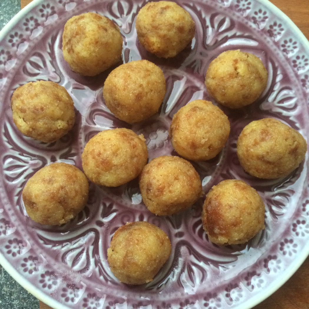 Aus der Masse dann kleine Bällchen formen. Ich habe immer knapp einen gehäuften Teelöffel genommen und diesen kräftig zusammengedrückt und in den Händen gerollt. Falls der Teig auseinanderfällt, einfach noch mehr Eierlikör hinzugeben.