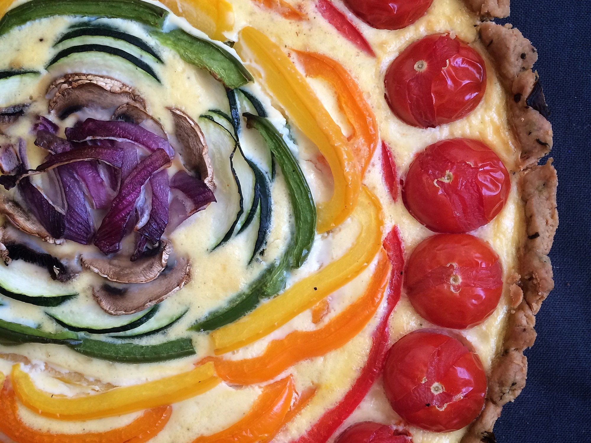 Heute gibt es eine kunterbunte Quiche für euch, die vor Vielfältigkeit nur so strotzt und in (fast) allen Farben des Regenbogens erstrahlt (blaues Gemüse hab ich leider nicht gefunden).