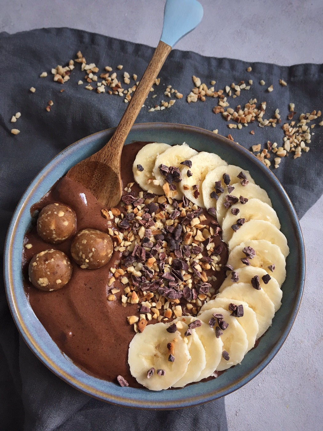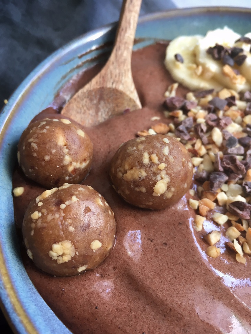 Bei mir gabs noch 1/2 Banane in dünne Scheiben geschnitten, 2 TL Haselnüsse und Kakaonips und 3 Peanut Butter Protein Balls (die habe ich letztens beim Rossmann entdeckt und war direkt verliebt. Hauptzutaten sind Datteln und Erdnüsse).
