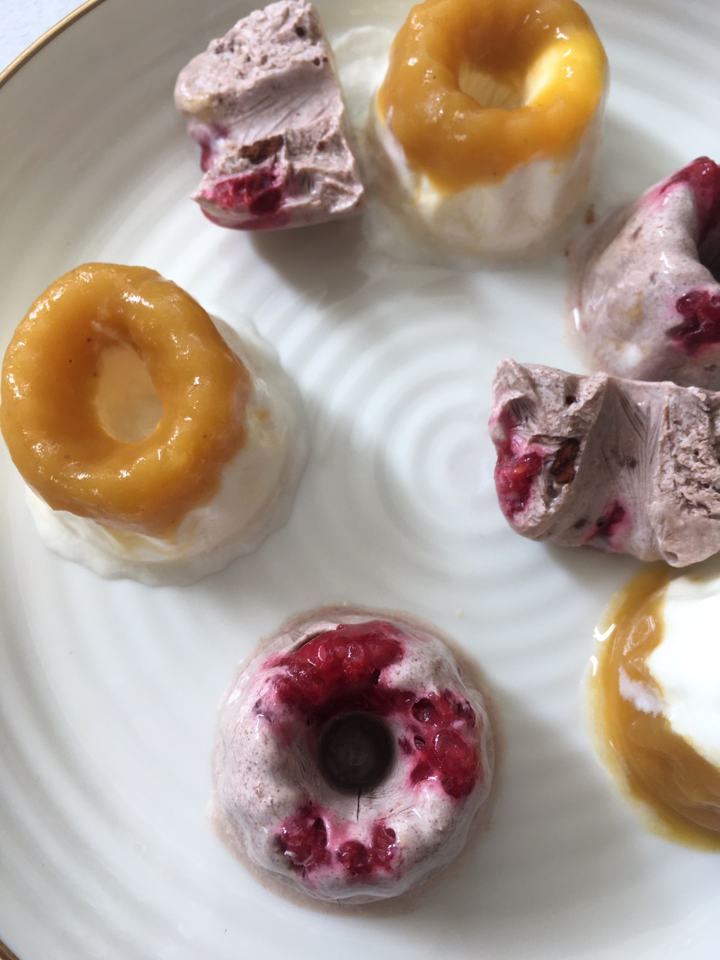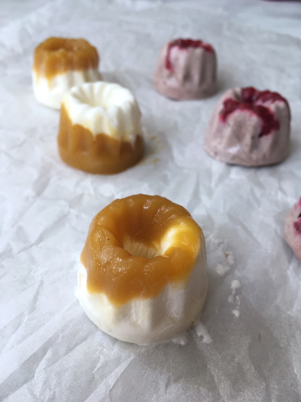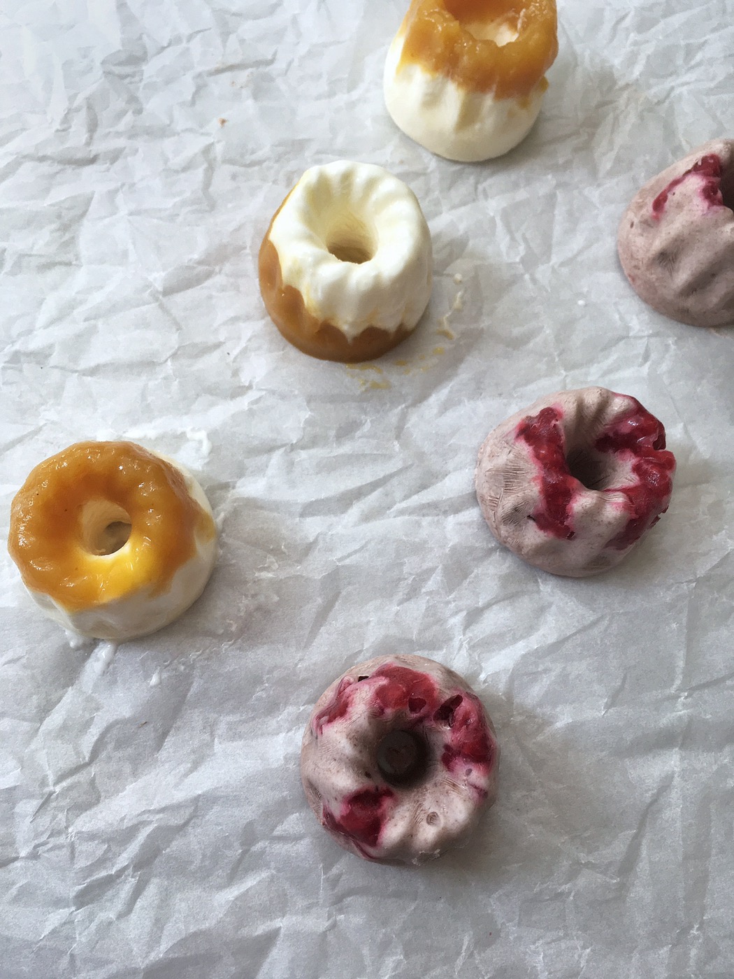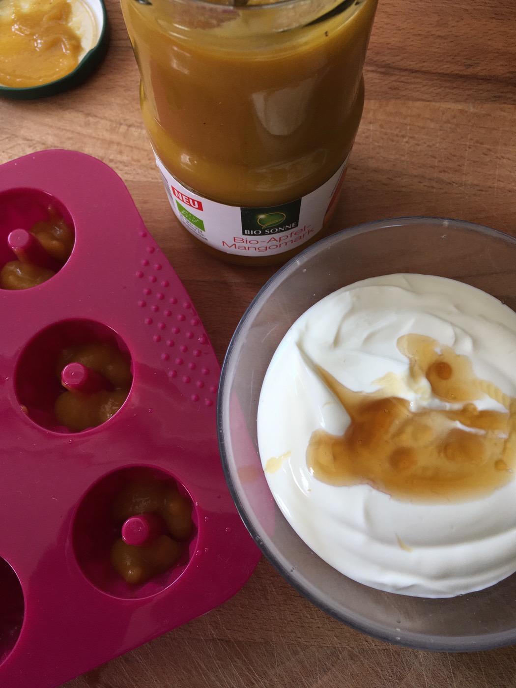 Mit einem Teelöffel habe ich je nach Lust und Laune erst Fruchtmus oder Joghurt in die Hälfte meiner Form gegeben und noch bisschen geschichtet.