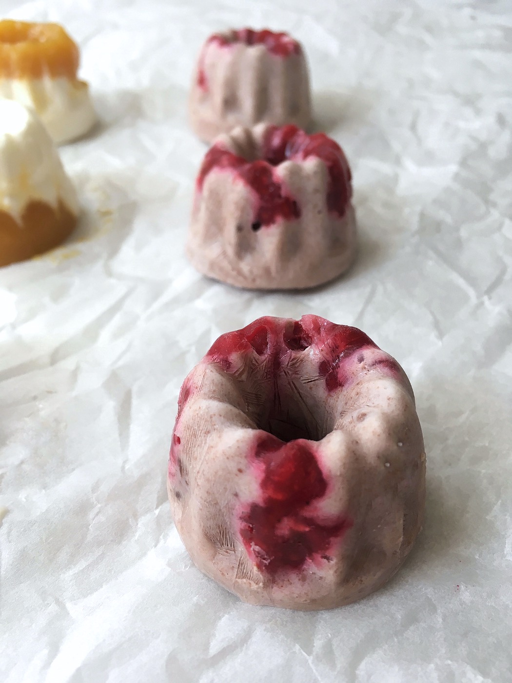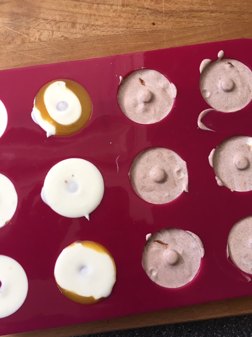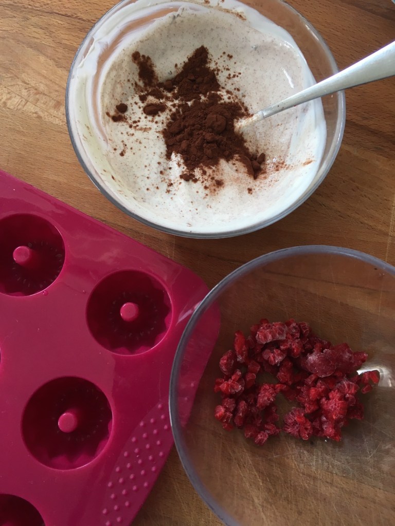 Den restlichen Joghurt habe ich mit etwas Backkakao vermengt, bis mir die Masse dunkel genug war und mit einigen zerbröselten gefrorenen Himbeeren in die restlichen Förmchen gegeben.
