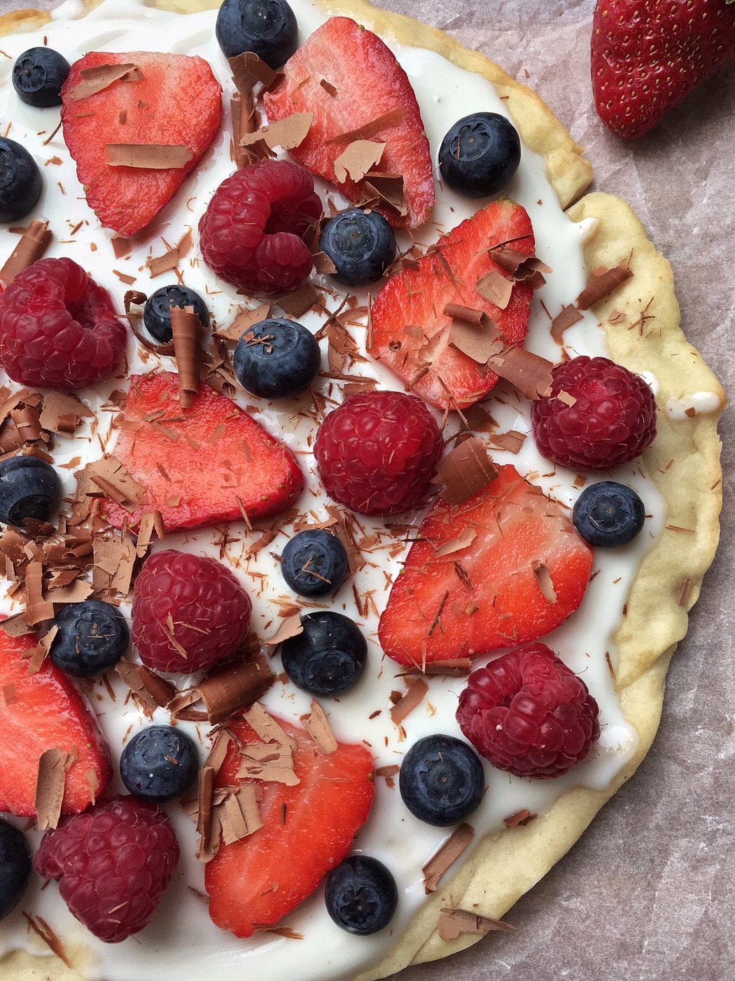 Mix together the yogurt, vanilla sugar and paste/extract and spread on the pizza. Then add the berries and scrape a bit of chocolate with the help of a knife or a potato peeler on everything.