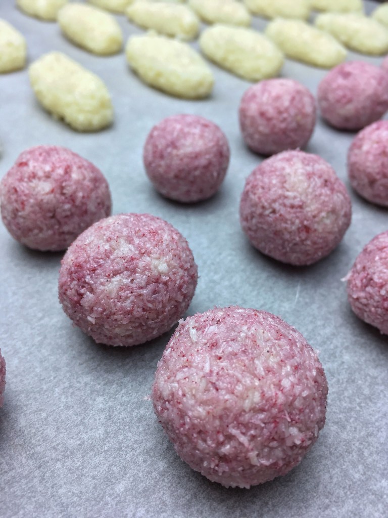 For the fancy version add about 2-3 tsp of the raspberry powder to the basic mix, form balls and dip them in melted white chocolate before you dust them with some more raspberry powder. Let the bounty bites completely cool and harden.