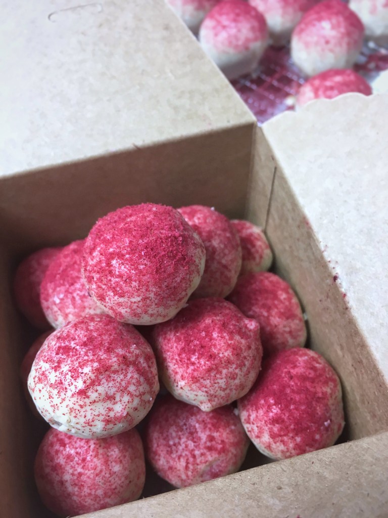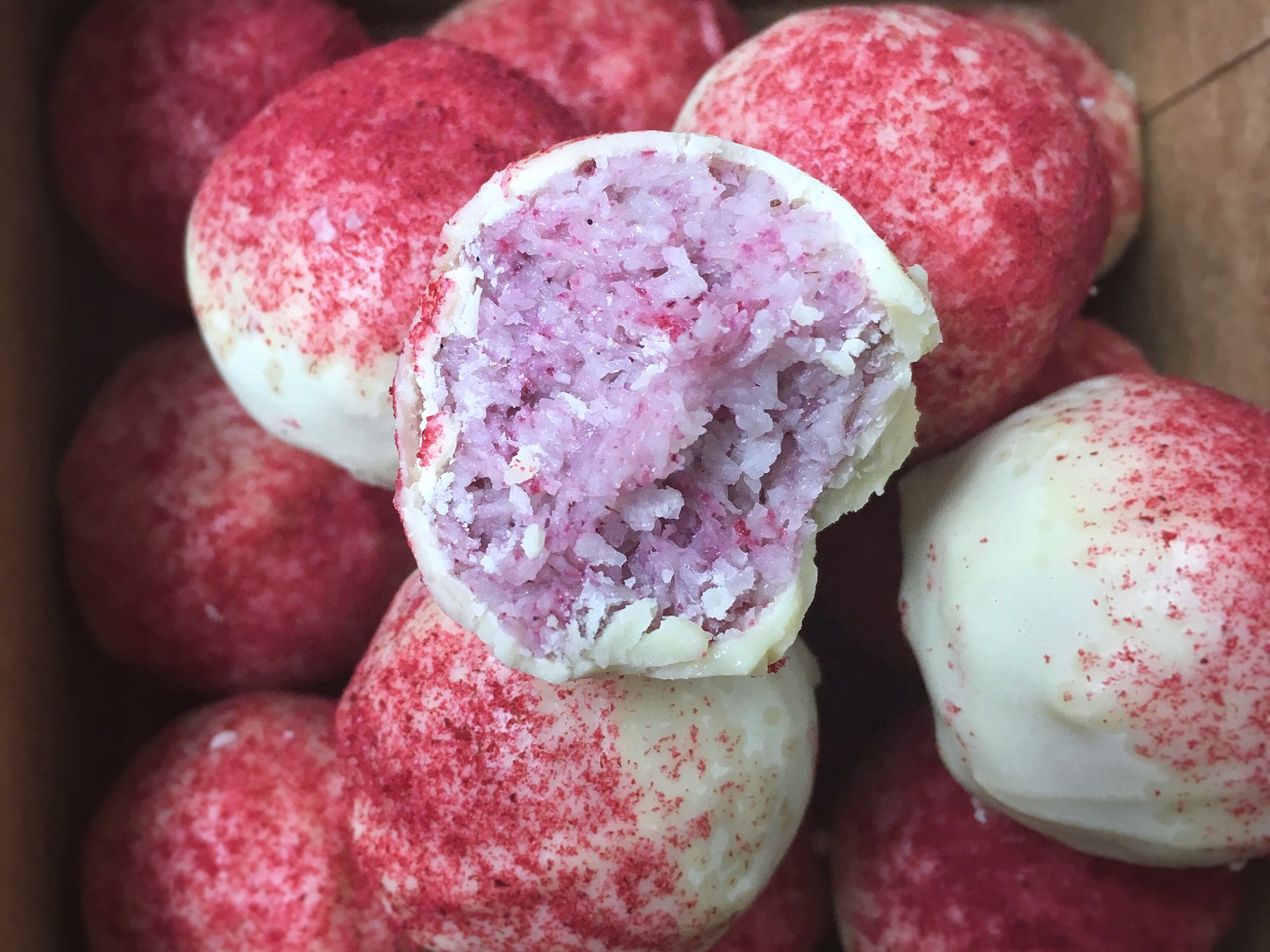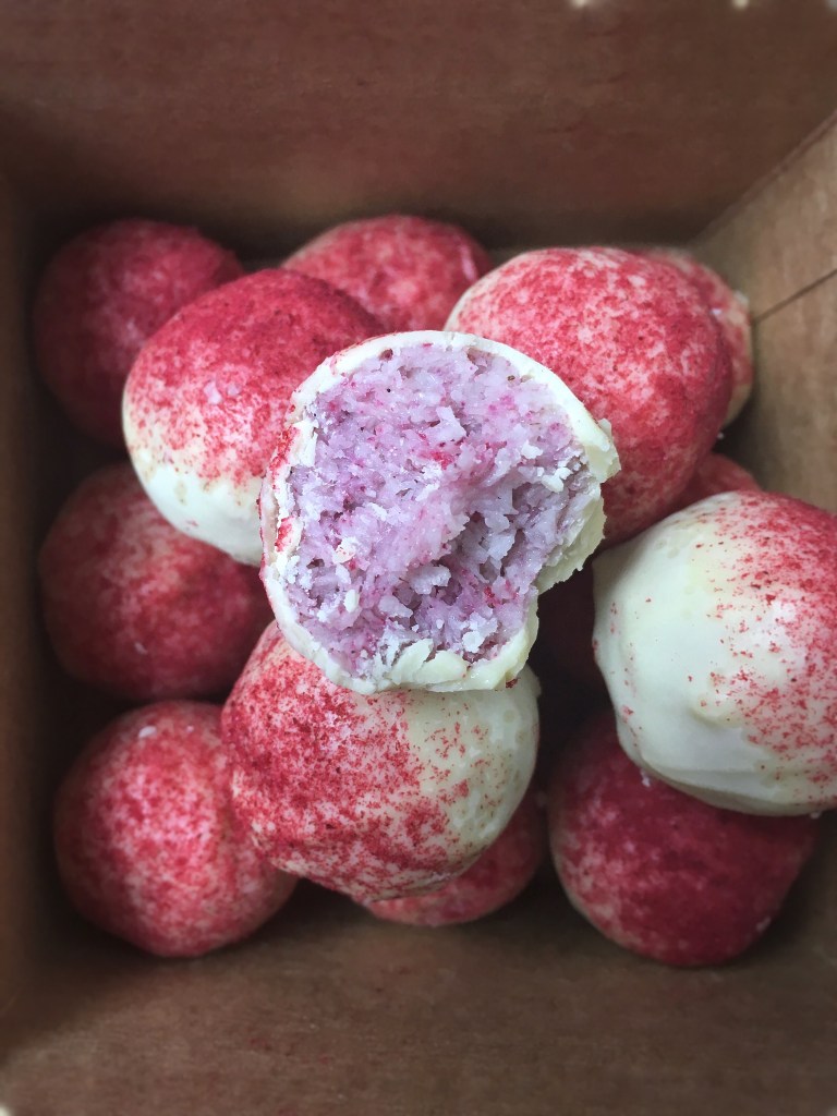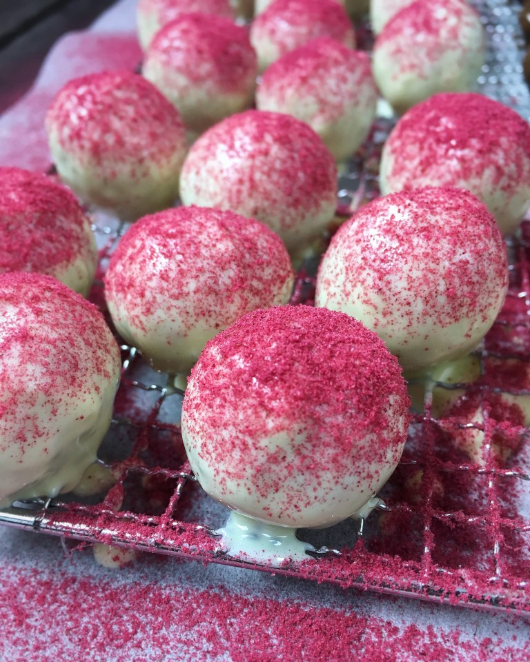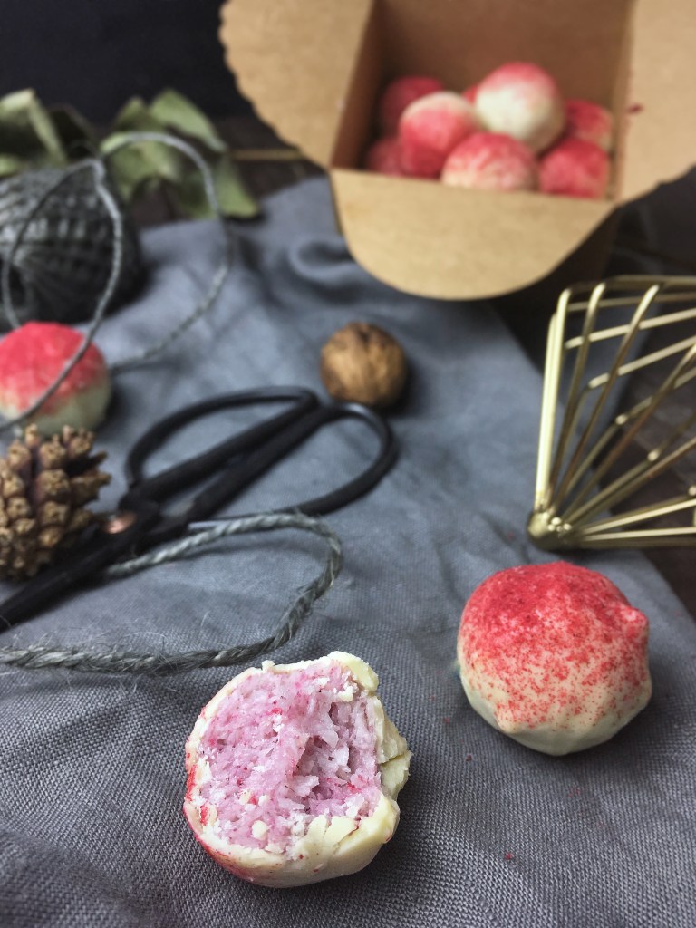 Für die fruchtige Variante vor dem Formen noch 2-3 TL Himbeerenpulver untermengen und dann Kugeln formen. Weiße Schokolade schmelzen und die Kugeln darin eintauchen. Mit restlichem Fruchtpulver bestäuben und einige Stunden fest werden lassen.
