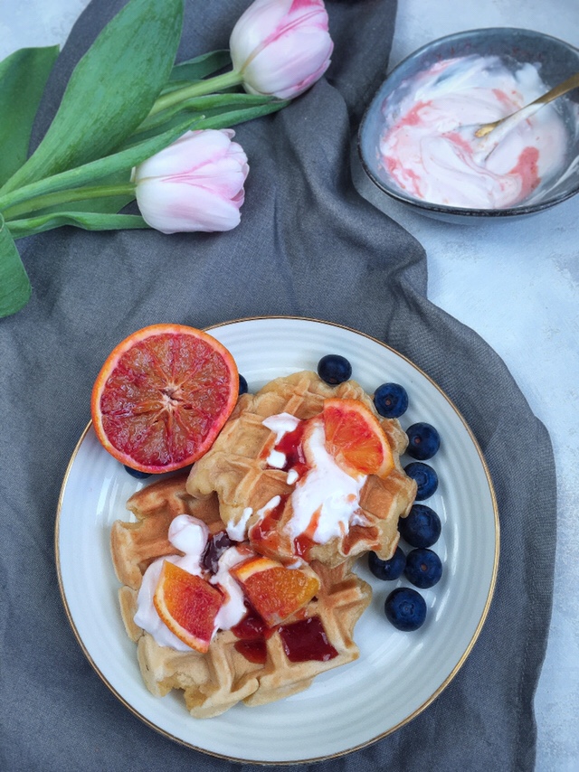 Ok, I have to admit, I am not a big fan of this valentine’s day. In my opinion it is more important to show your loved ones on more than one day a year what they mean to you. But I can understand you want to surprise and impress your bae on this day, too. So I have the perfect last minute idea for you. These yogurt waffles with blood orange syrup will melt hard hearts in no time and are super easy to make. And who can say no to a good breakfast or brunch? I know, I can’t!