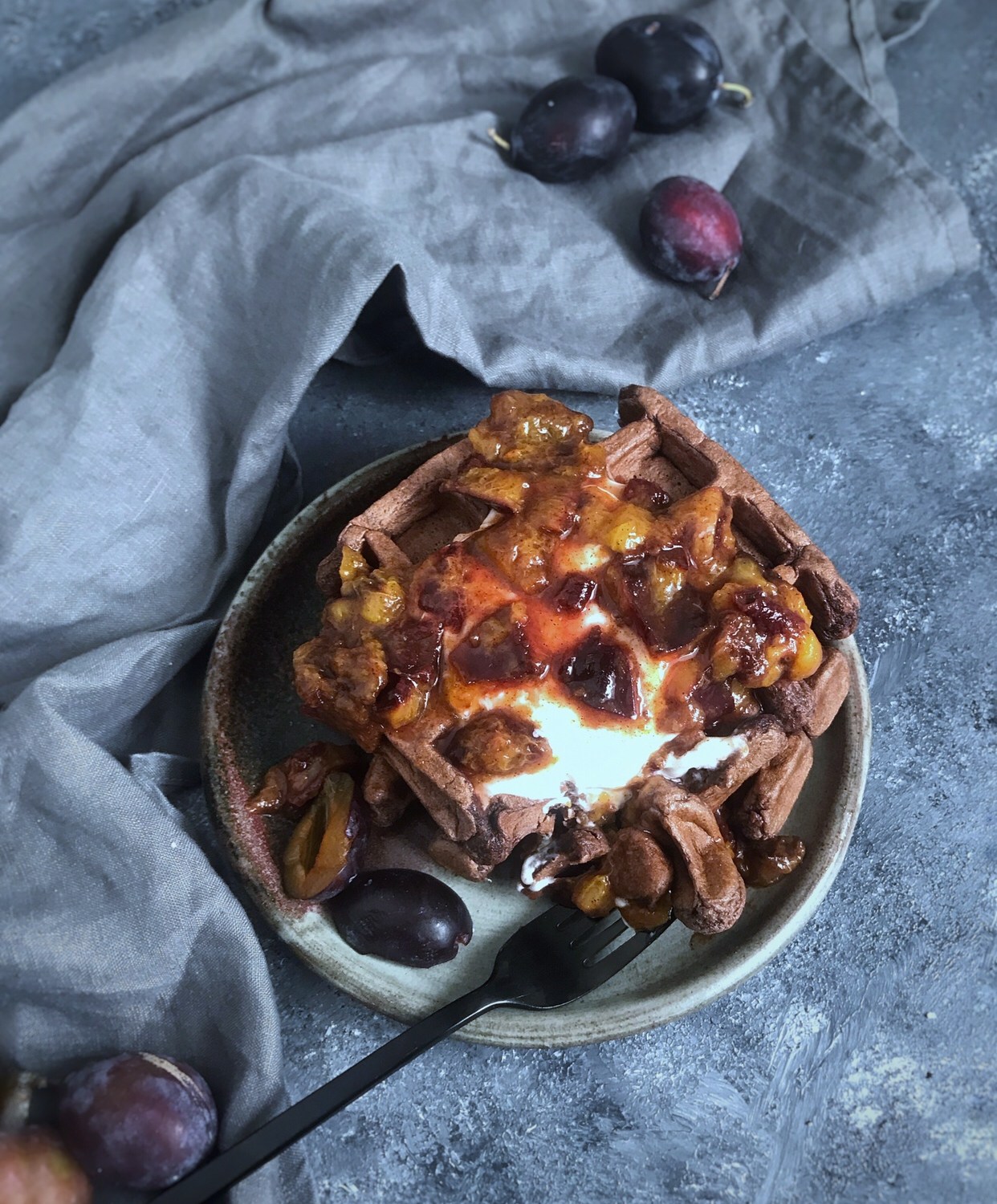 Schokoladen-Zimt-Waffeln mit easy Zwetschgenkompott