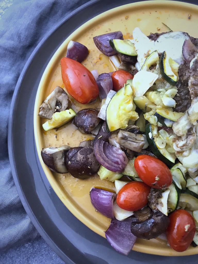 Gemüse nach Lust und Laune klein würfeln oder schneiden. Ich mach mir da ehrlich gesagt nicht soooo viel Arbeit. Die Tomaten lasse ich ganz, die Champignons werden geviertelt, der Knoblauch und die Zwiebeln nur grob geschnitten und die Zucchini ebenso.