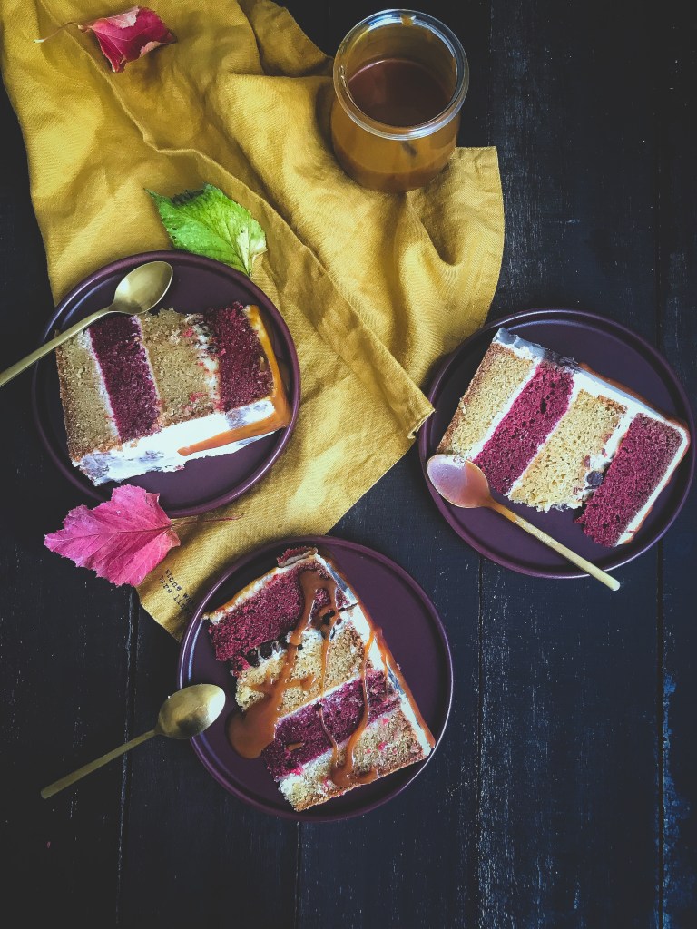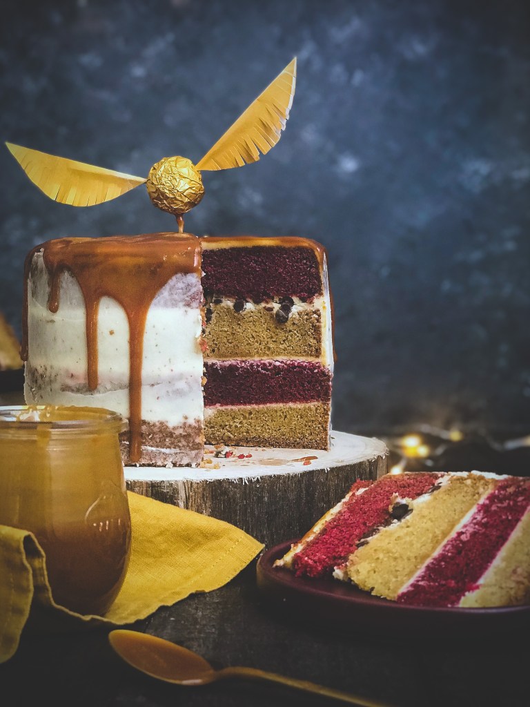 Passend zu den Hausfarben von Gryffindor (jaaa, war doch klar oder?) gibt es zwei verschiedene Kuchenschichten in Gold und Dunkelrot mit einer Frischkäsebuttercreme, herrlich goldenem Karamell und einem Hauch von Schokolade. Wir wissen ja bereits seit dem Gefangenen von Askaban, dass Schokolade für alles toll ist, z.B. auch wenn man sich von einem kleinen Zusammenstoß mit einem Dementoren erholen muss. Ja, und da Gryffindor eh wieder das nächste Quidditchspiel rockt , gibt es noch den goldenen Schnatz on top 🙂