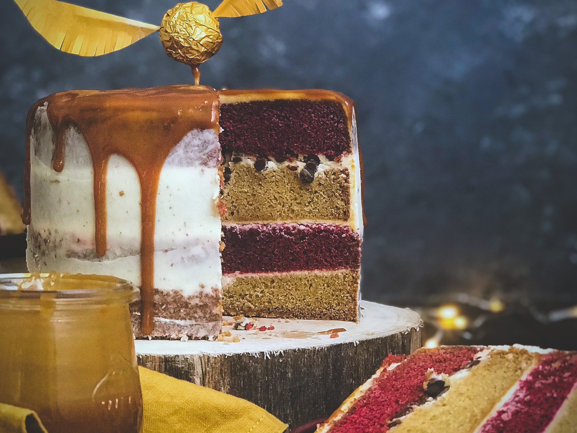 Passend zu den Hausfarben von Gryffindor (jaaa, war doch klar oder?) gibt es zwei verschiedene Kuchenschichten in Gold und Dunkelrot mit einer Frischkäsebuttercreme, herrlich goldenem Karamell und einem Hauch von Schokolade. Wir wissen ja bereits seit dem Gefangenen von Askaban, dass Schokolade für alles toll ist, z.B. auch wenn man sich von einem kleinen Zusammenstoß mit einem Dementoren erholen muss. Ja, und da Gryffindor eh wieder das nächste Quidditchspiel rockt , gibt es noch den goldenen Schnatz on top 🙂