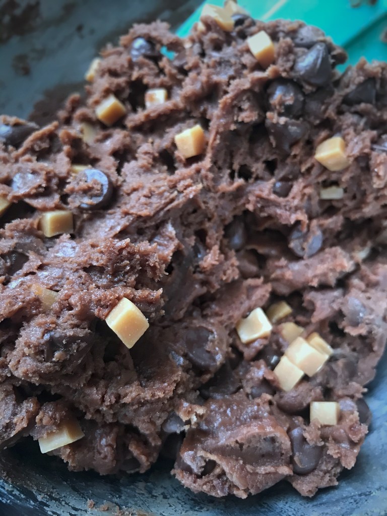 Mehl, Backpulver und Salz untermengen und mit Hilfe des Teigschabers die Chocolate Chips und ca. 2-3 der Karamellstückchen unterheben. Den Teig ca. eine halbe Stunde im Kühlschrank fest werden lassen.