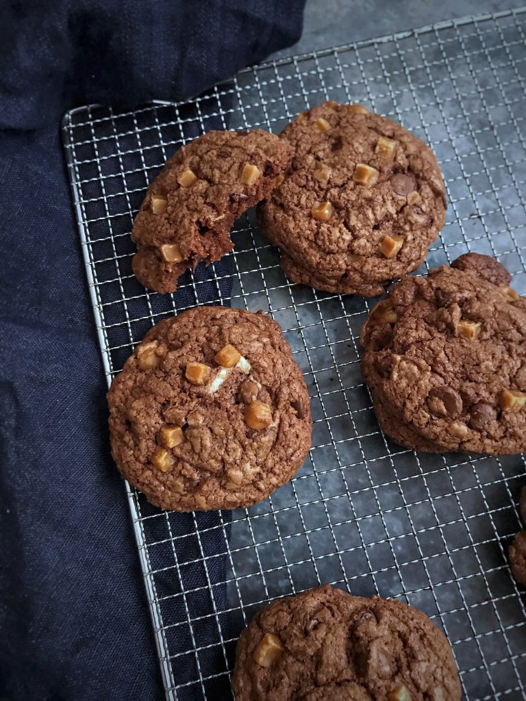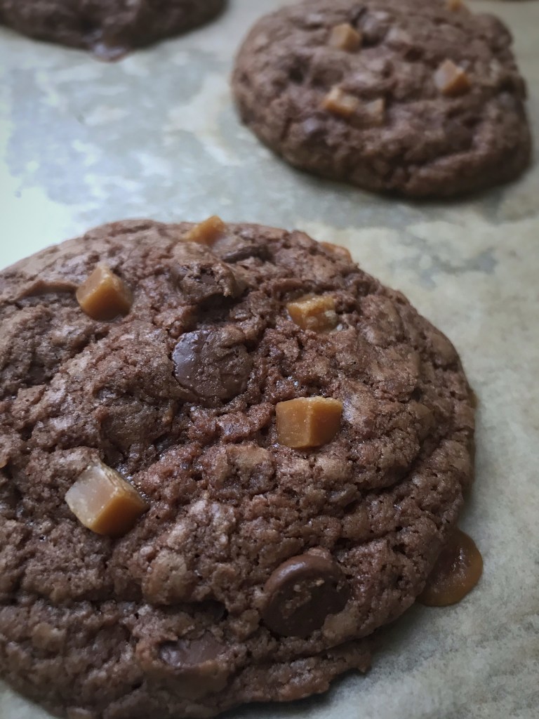 Ich bin noch nicht so ganz in der Weihnachtsstimmung, also startet heute die Weihnachtsbäckerei mit einem nicht sehr typisch weihnachtlichen Rezept: schokoladigste Chocolate Chip Cookies mit extra Karamellstückchen. Und Schokolade geht ja eh immer wie ich finde 🙂 und wer weiß, vllt gibt es ja zum 2. Advent / Nikolauswochenende etwas adventlicheres (ist das überhaupt ein Wort?)