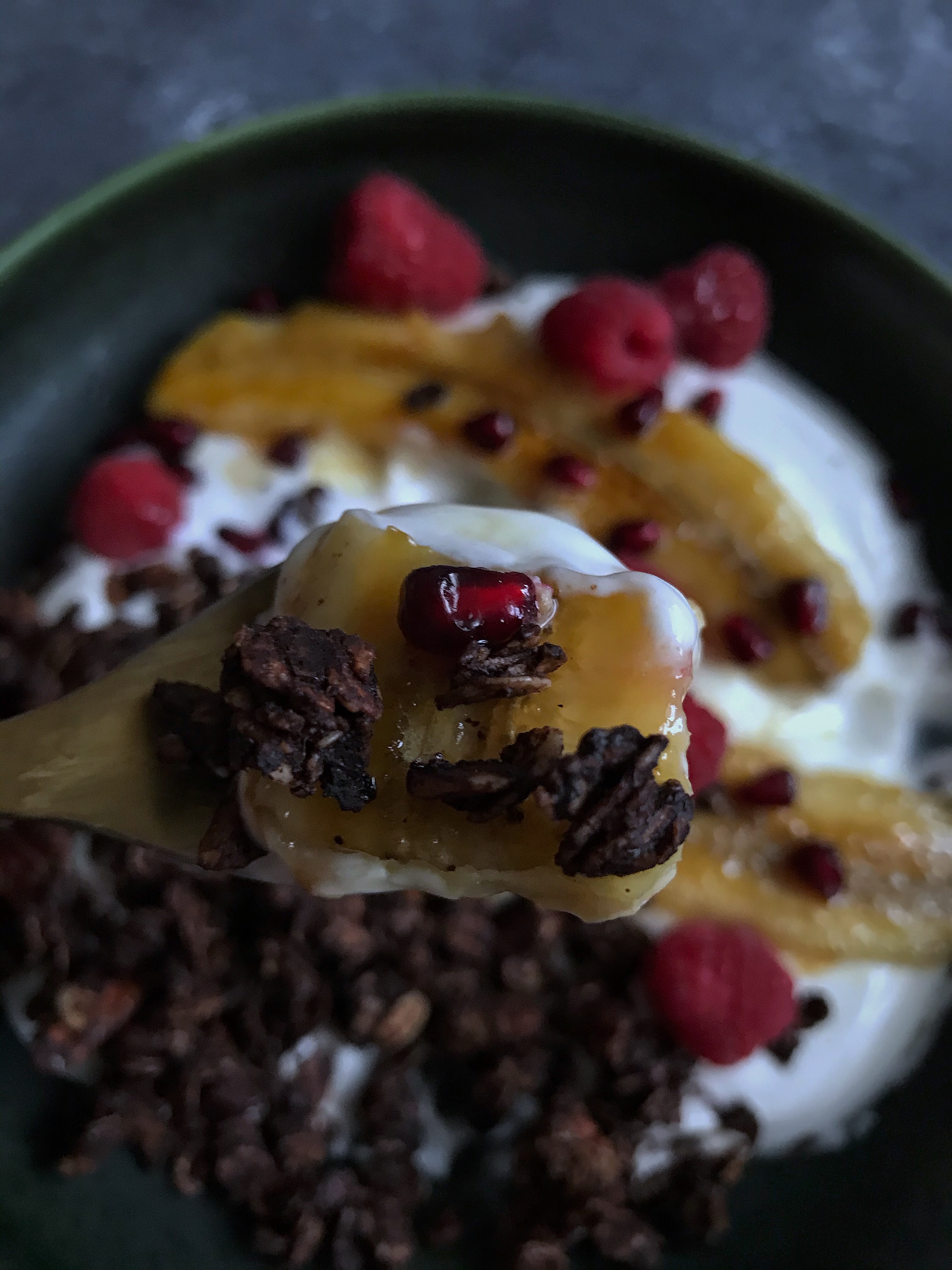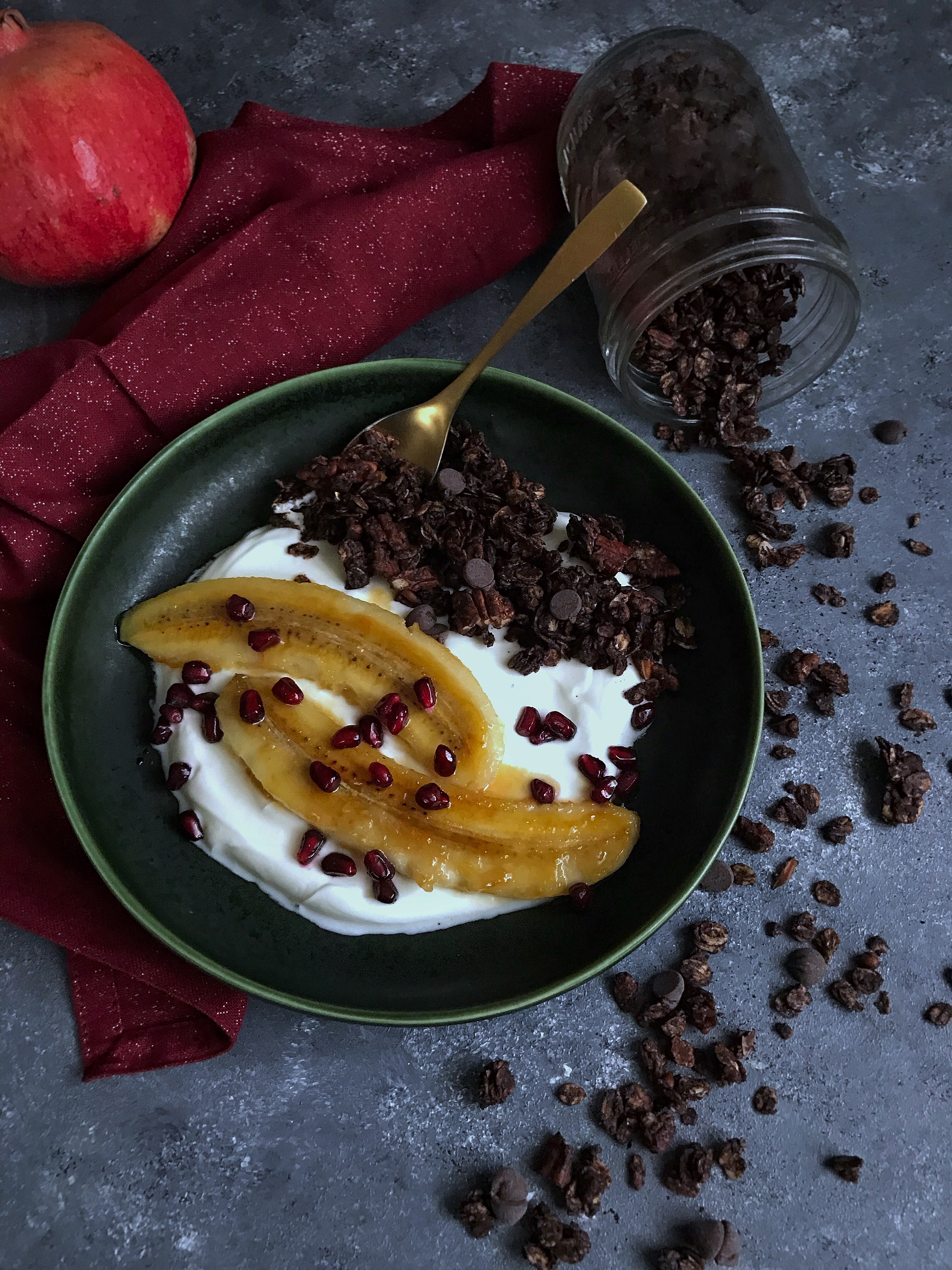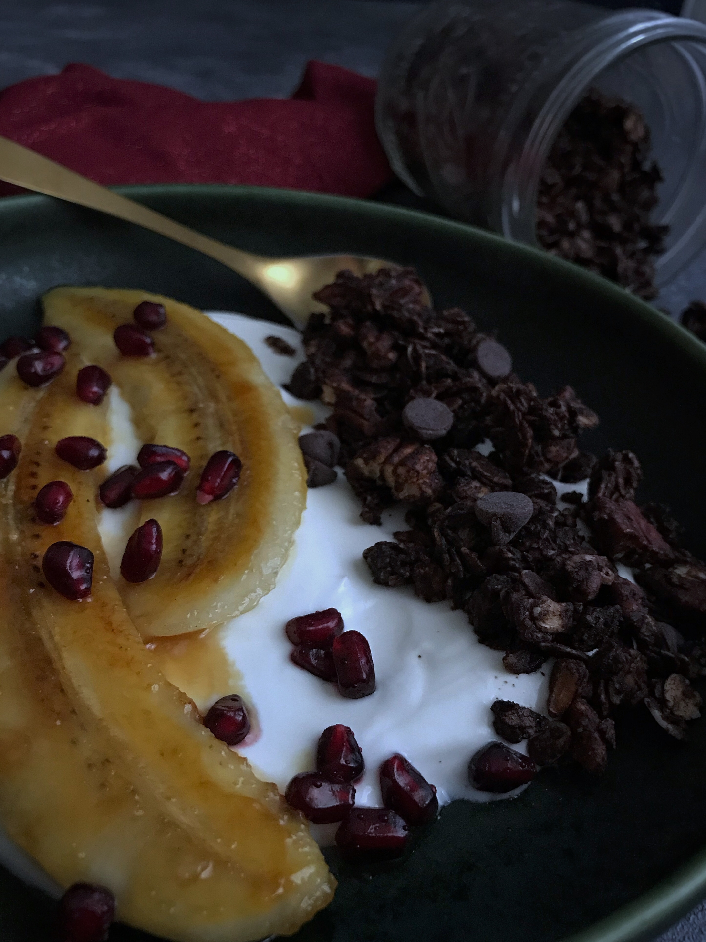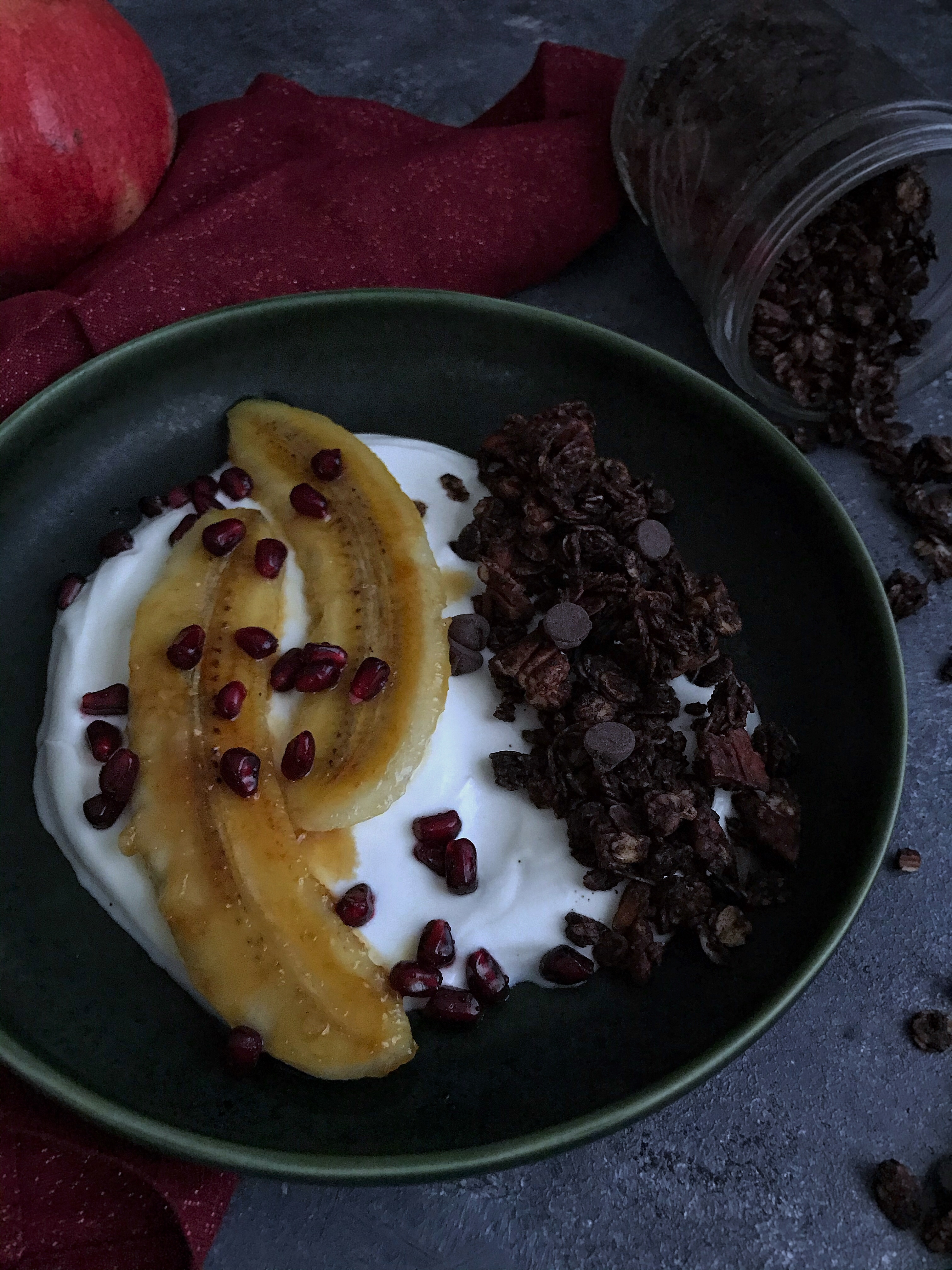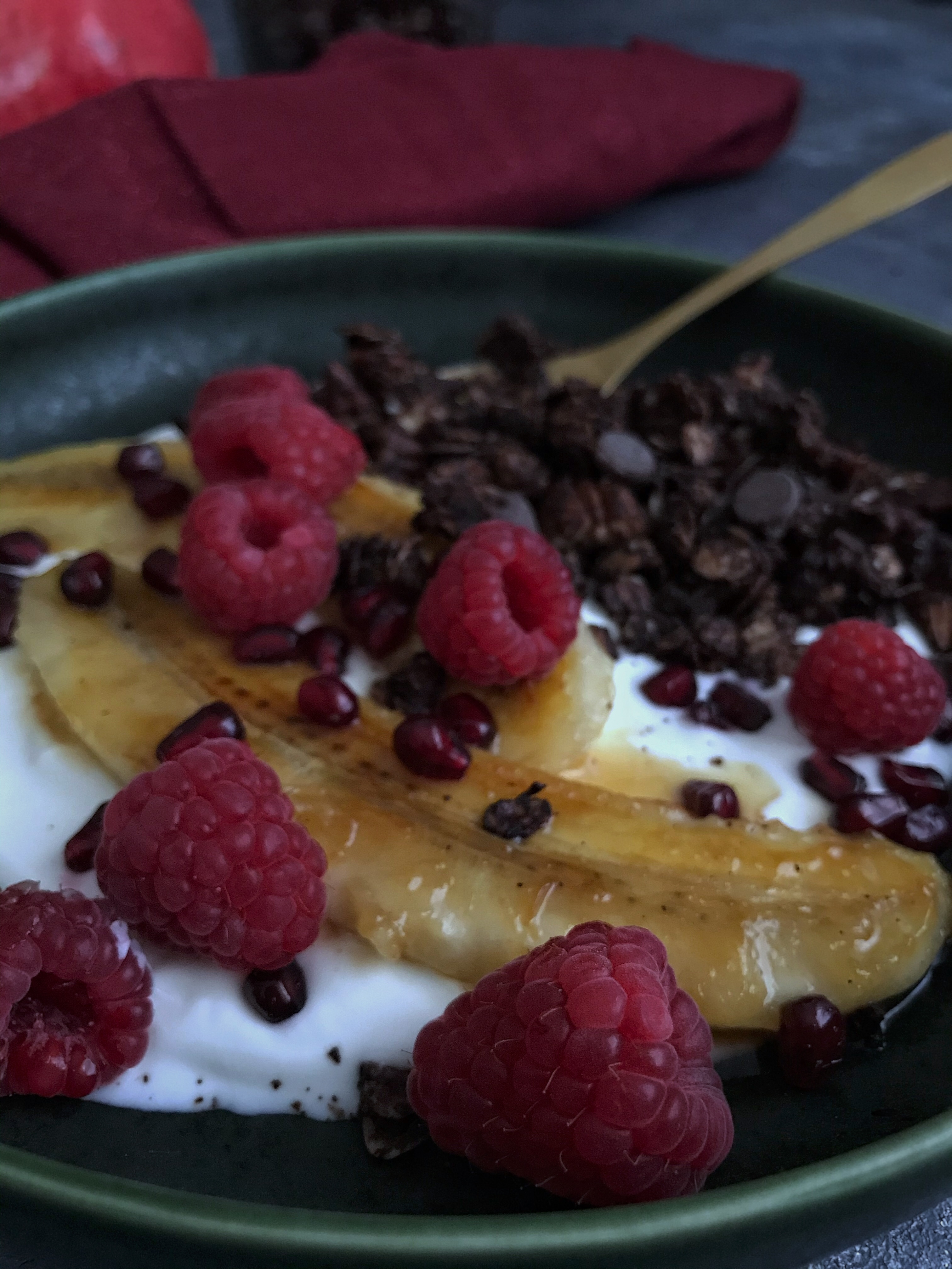Mir schmeckt das Granola sehr gut mit griechischem Joghurt und etwas Obst, zB auch mit in Honig gebratener Banane, Granatapfelkernen und Himbeeren. Aber auch mit Milch ist’s super lecker 🙂