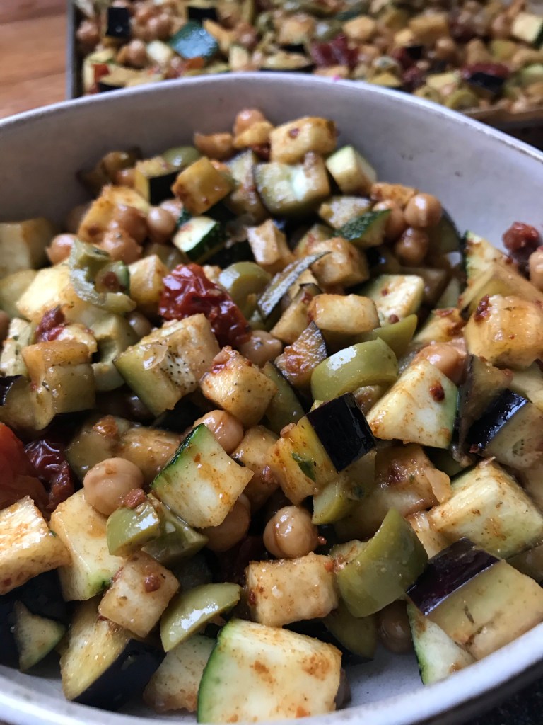 Zucchini und Aubergine in kleine Würfel schneiden. Die Kichererbsen abtropfen lassen und kurz abwaschen. Ich mag sie lieber, wenn sie keine Haut mehr haben. Ist zwar bisschen Arbeit, lohnt sich aber 🙂 (ist allerdings kein Muss) Oliven und Tomaten ebenfalls kleinschneiden.