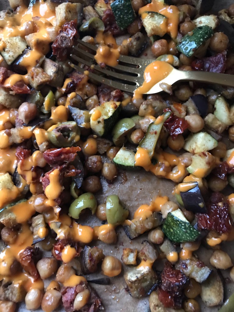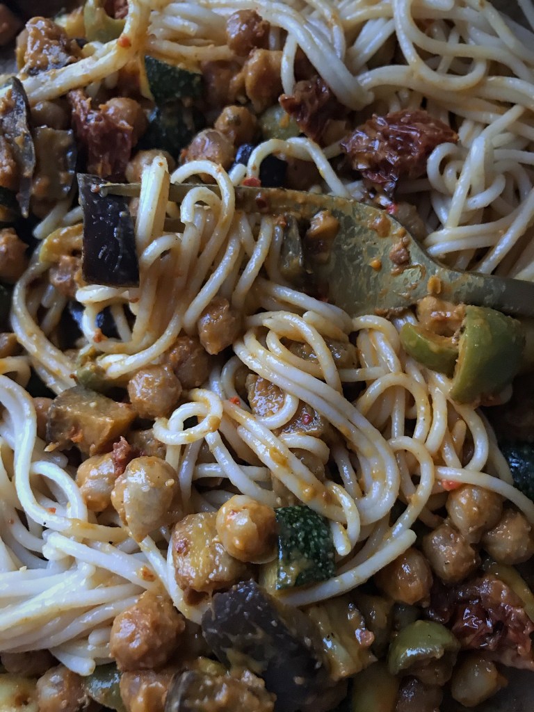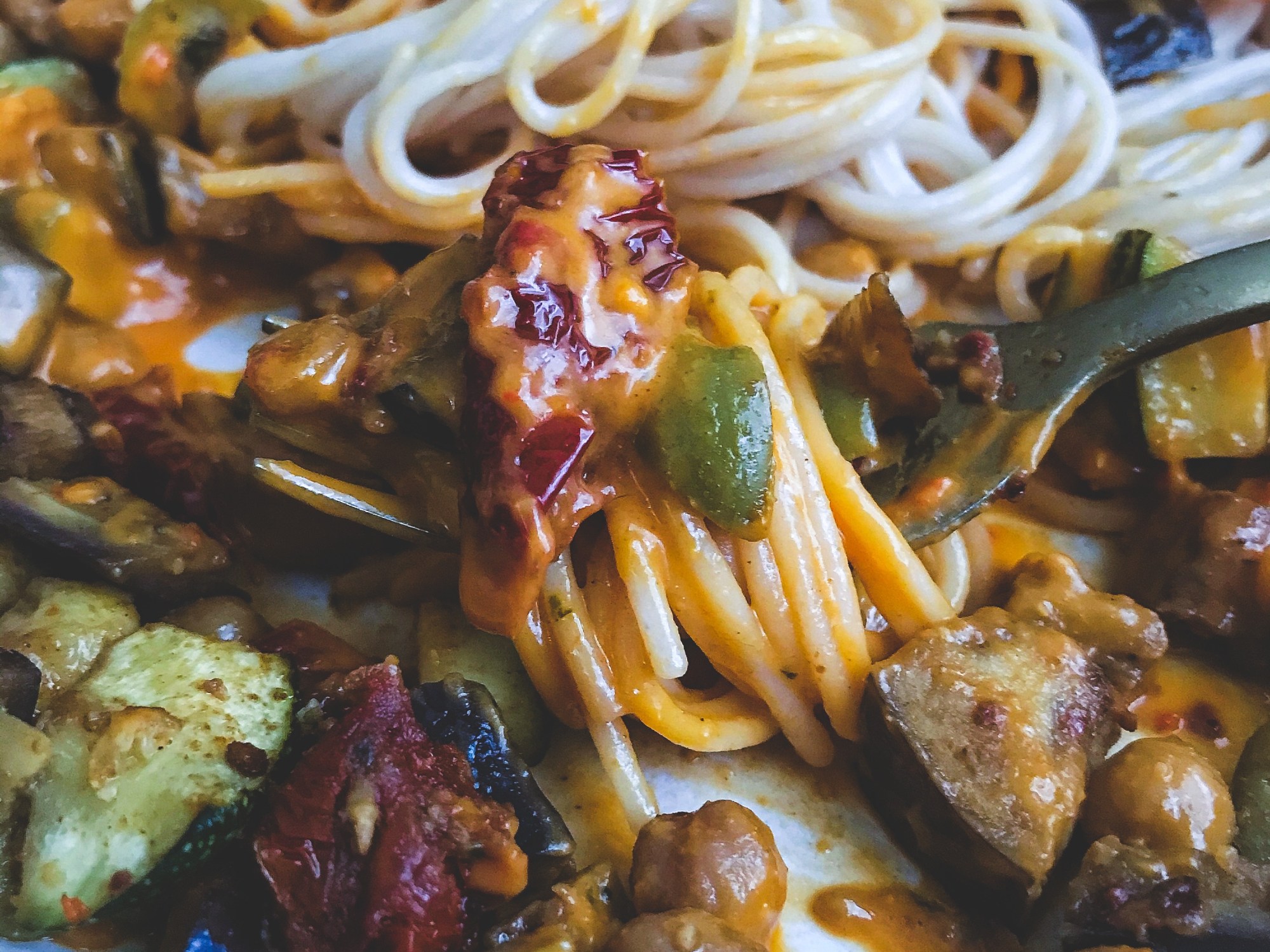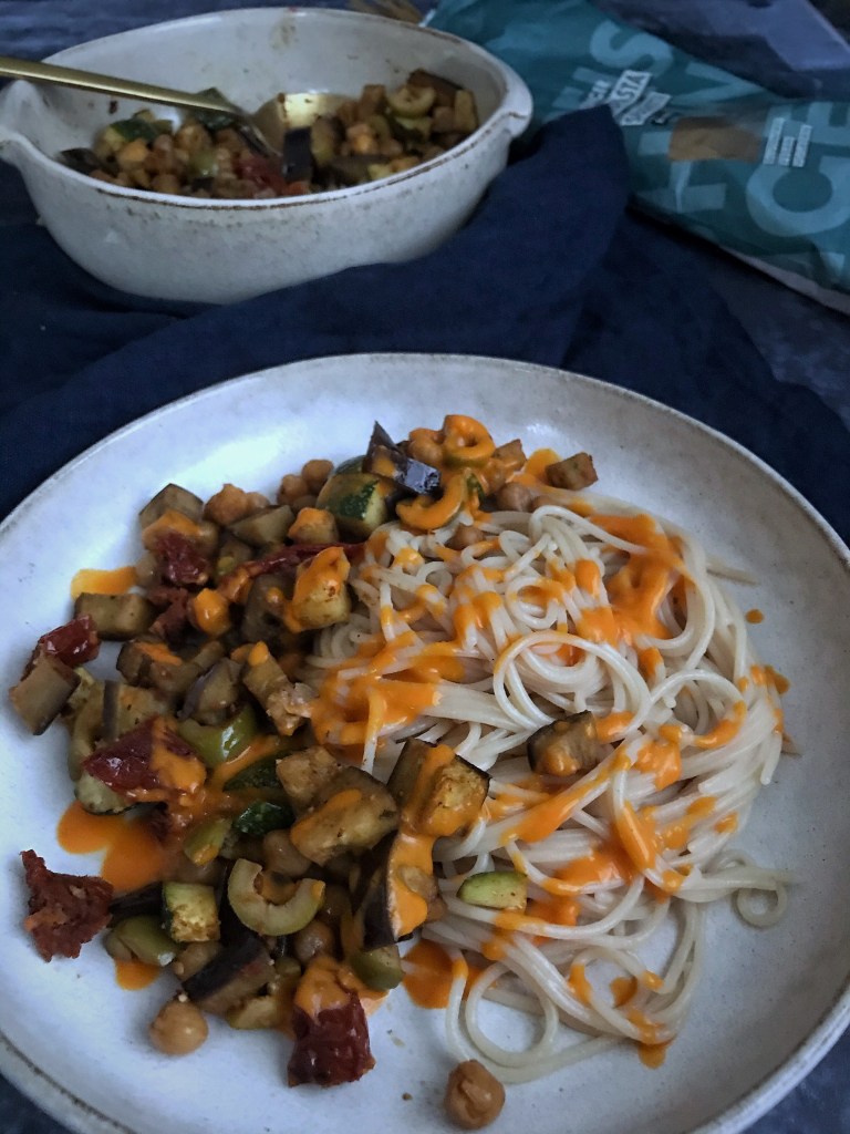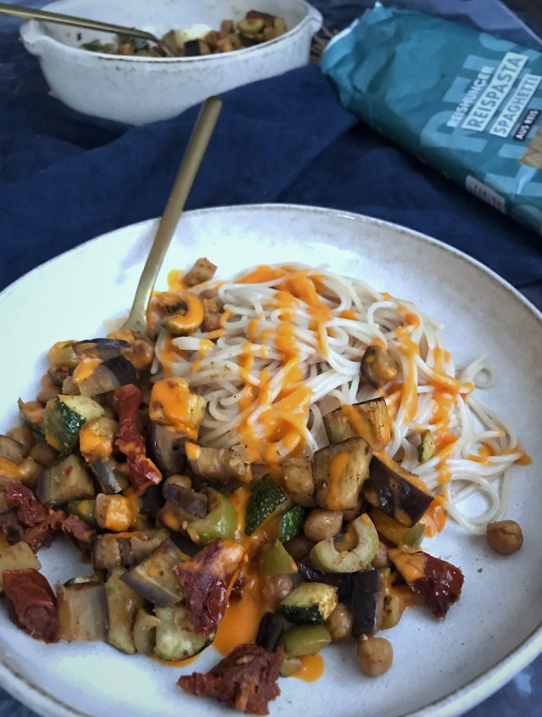 Gerade zu meinem Ofengemüse mit scharfer Hummussauce sind Spaghetti ein Träumchen und haben auch am nächsten (und übernächsten) Tag in der Mittagspause im Büro noch großartig geschmeckt. Klingt doch super oder?