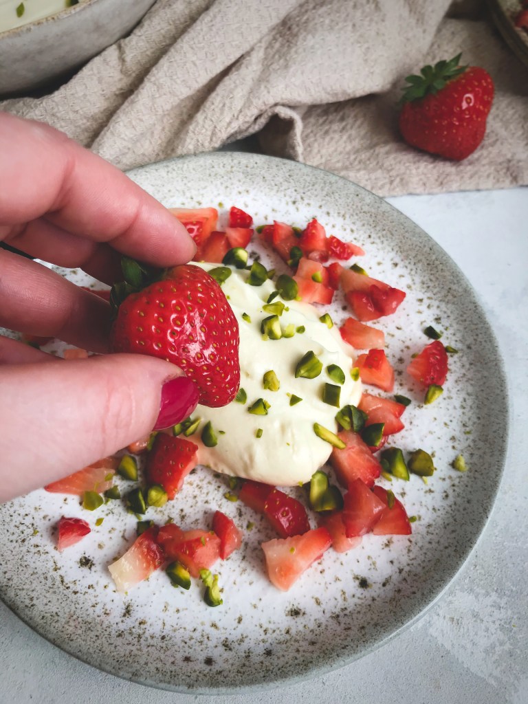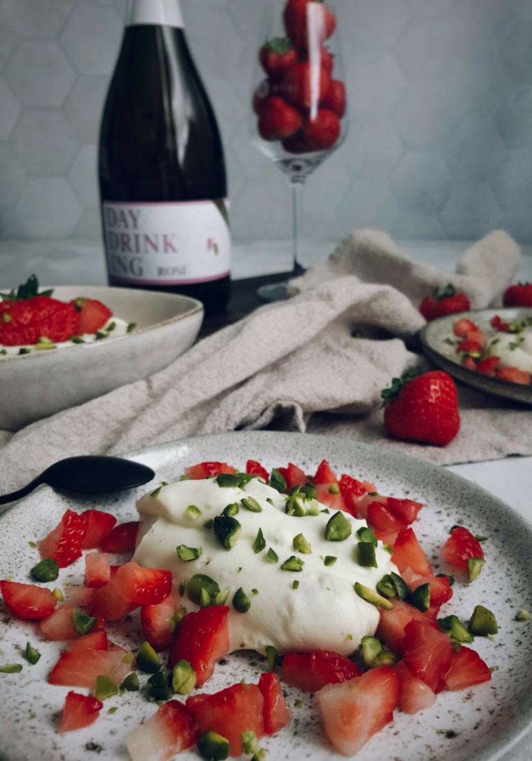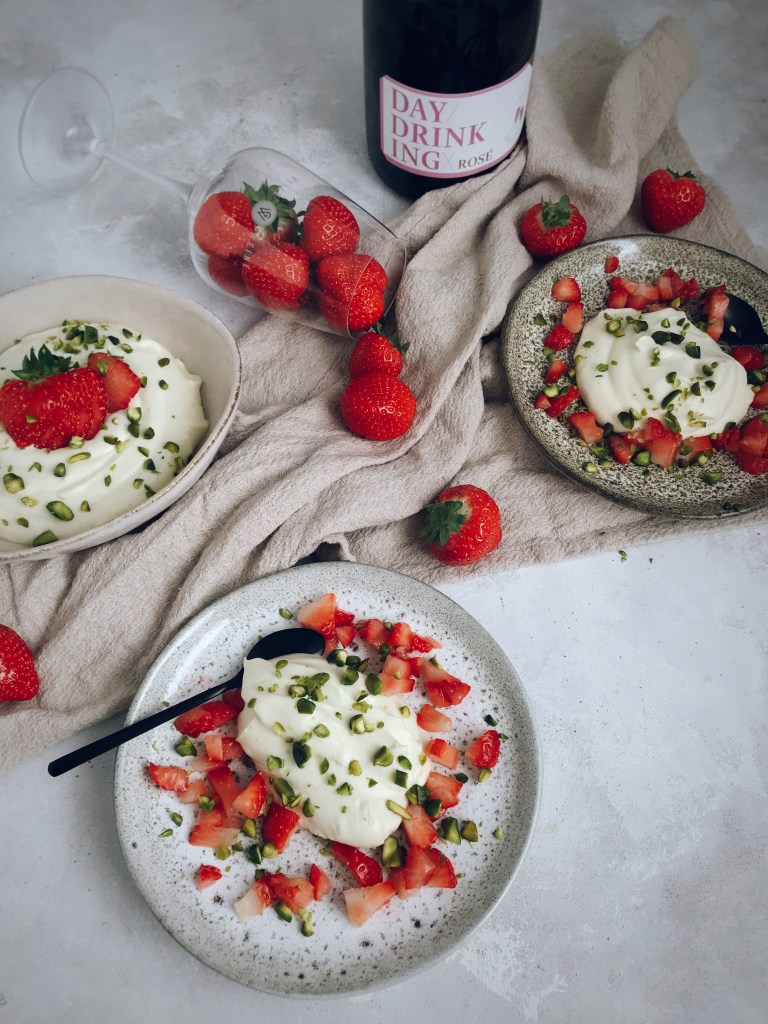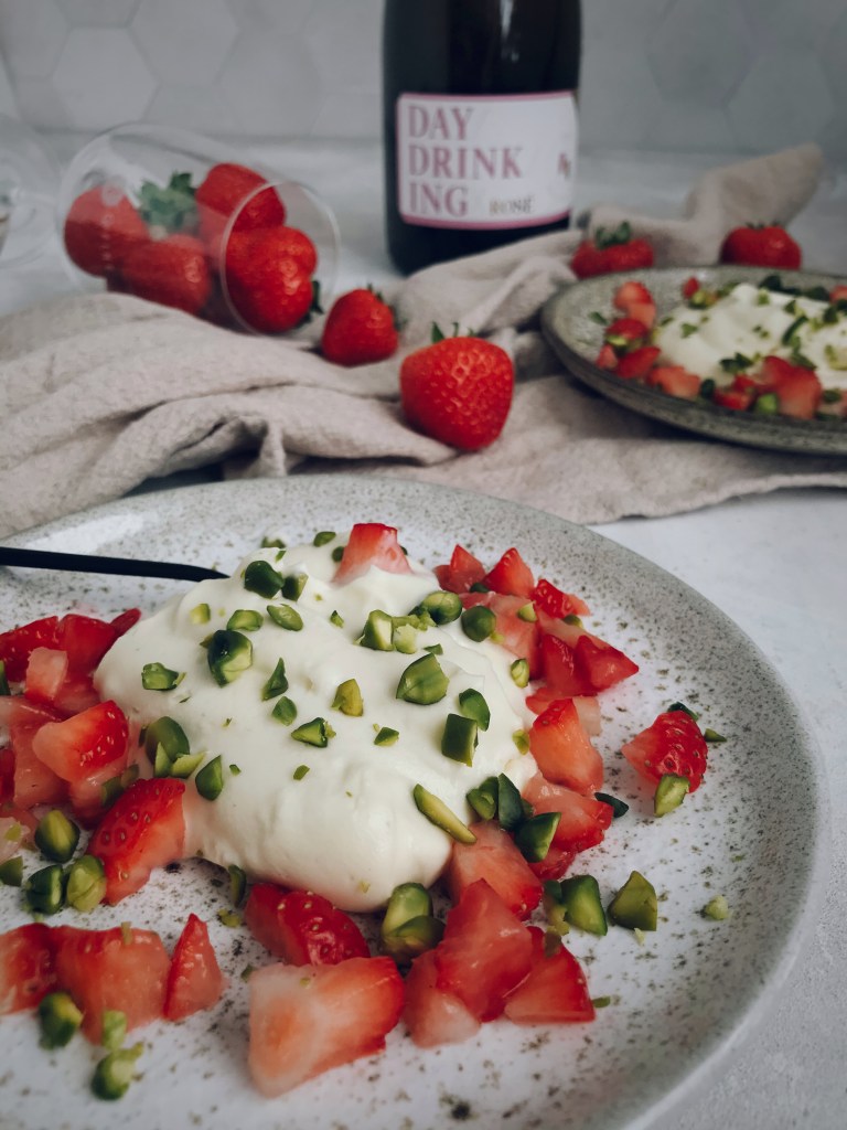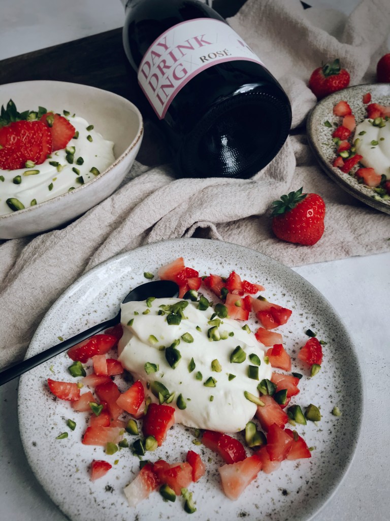 Mit Erdbeeren und Pistazien dekorieren und mit einem Gläschen Sparkling Rosé genießen – der geht eh zu jeder Tageszeit und kommt nicht umsonst aus der Daydrinking-Reihe.