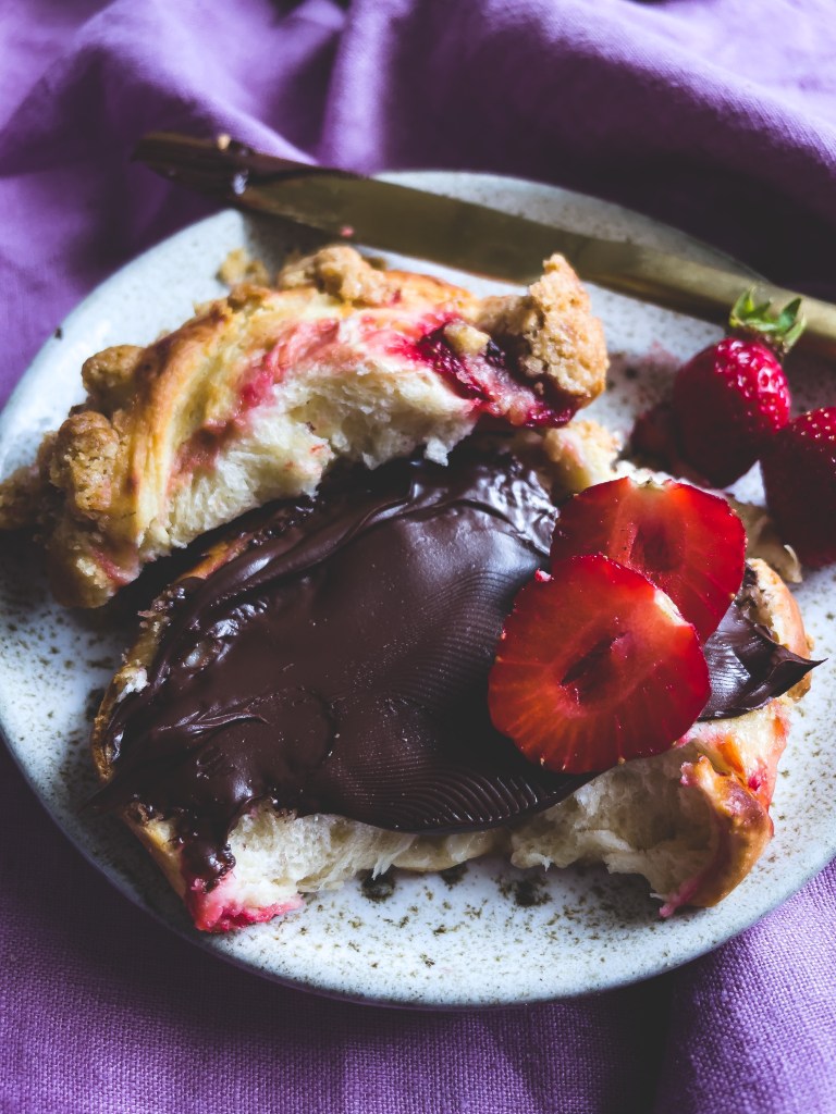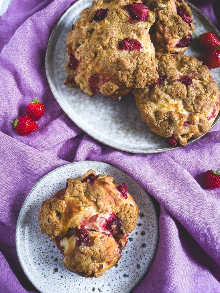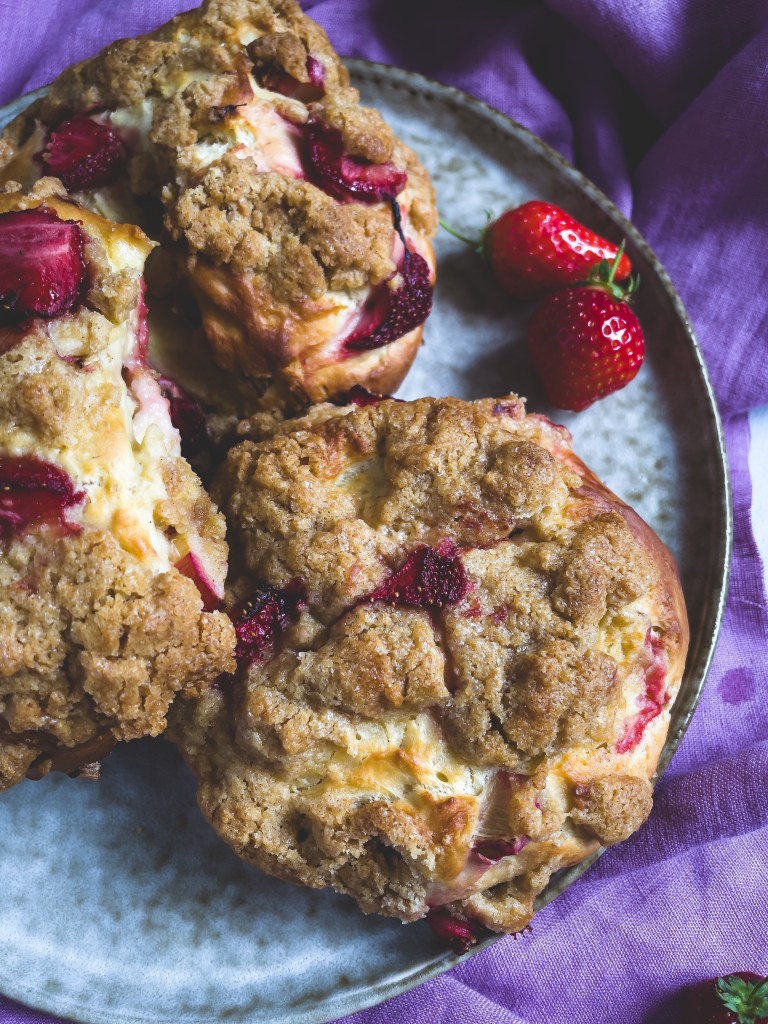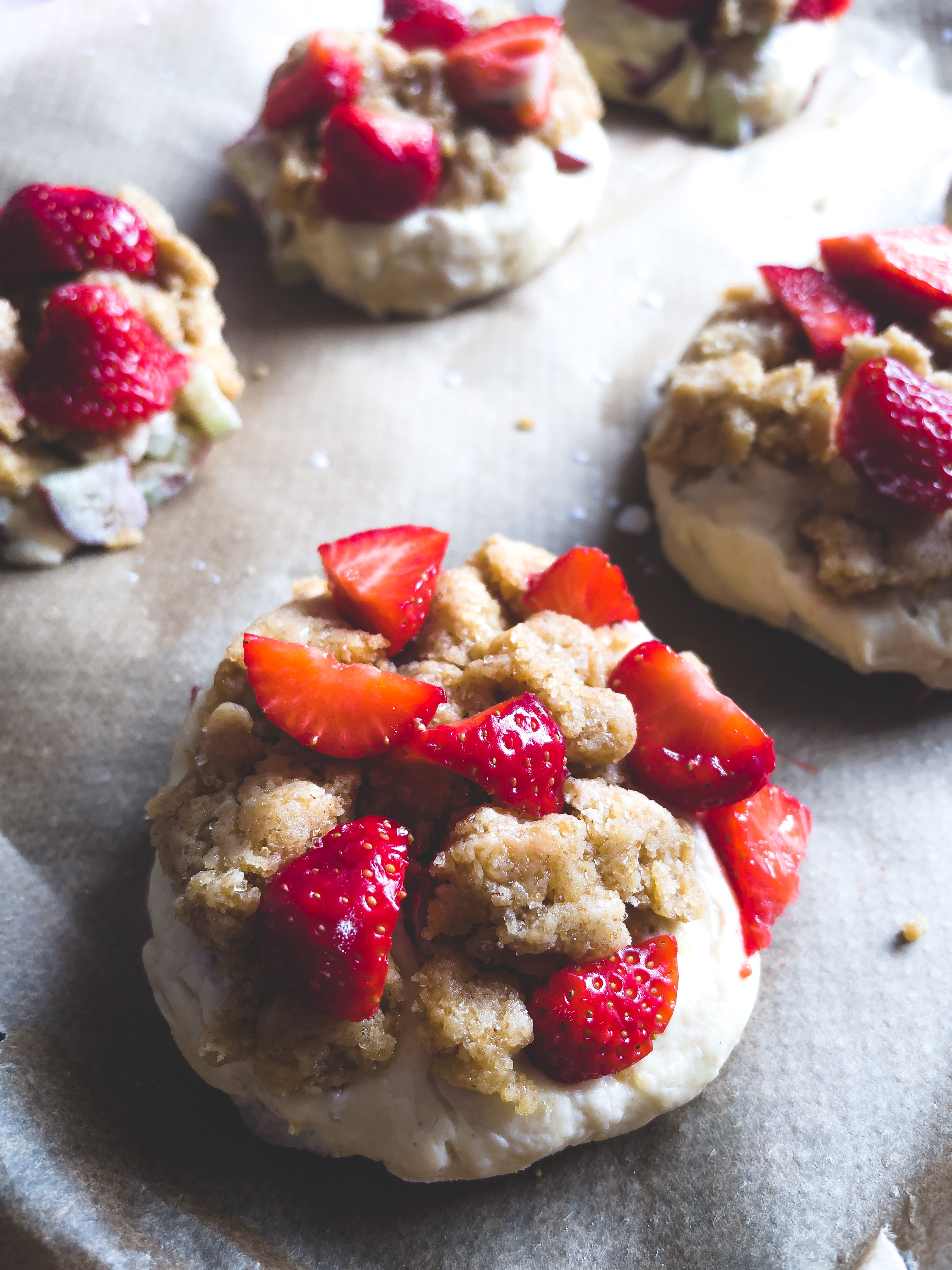 2-3 Stangen Rhabarber in kleine Stücke schneiden und unter den Teig kneten. Teig in eine Rolle formen und 12 Stücke schneiden. Die Stücke mit etwas Milch bepinseln und mit Streuseln und Erdbeeren dekorieren und leicht andrücken.