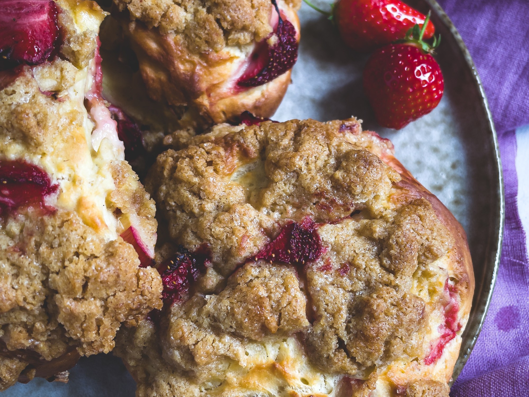 2-3 Stangen Rhabarber in kleine Stücke schneiden und unter den Teig kneten. Teig in eine Rolle formen und 12 Stücke schneiden. Die Stücke mit etwas Milch bepinseln und mit Streuseln und Erdbeeren dekorieren und leicht andrücken.