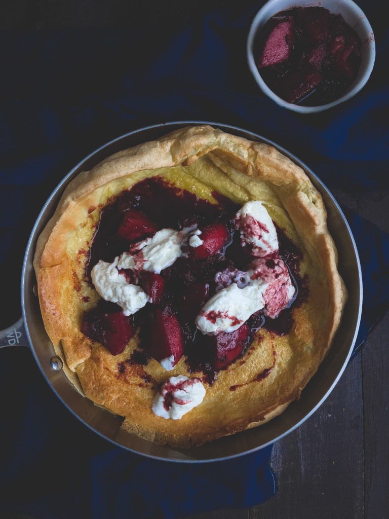 Langsam steht die Adventszeit an und die schreit für mich immer nach kuscheligem Essen, das voller Zimt und Glücksgefühle ist. Was würde da besser passen als ein Dutch Baby aus dem Ofen, was noch mit Apfelröster und Ziegenfrischkäse daherkommt? Die Äpfel werden mit ganz viel Zimt oder Lebkuchengewürz in Zucker karamellisiert und in Rotwein eingekocht. Allein dieser Duft, der die Wohnung erfüllt, macht einen direkt glücklich!