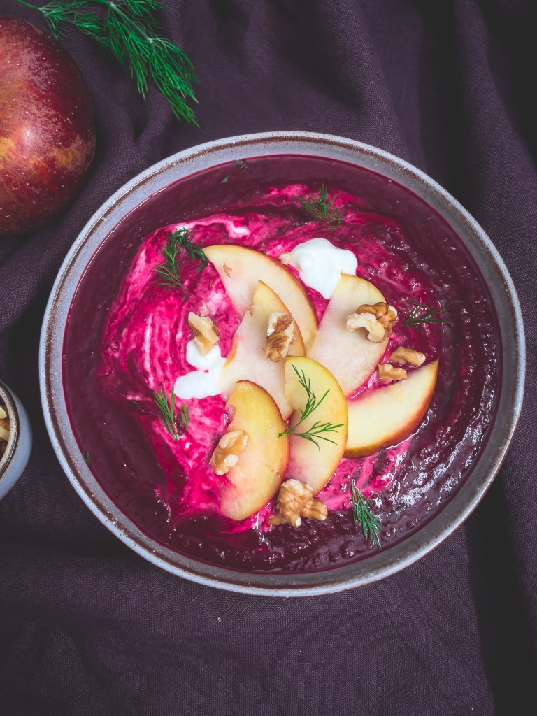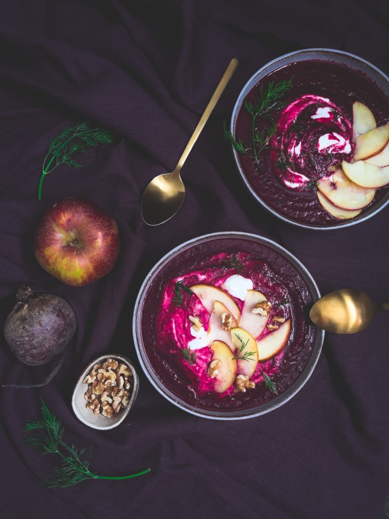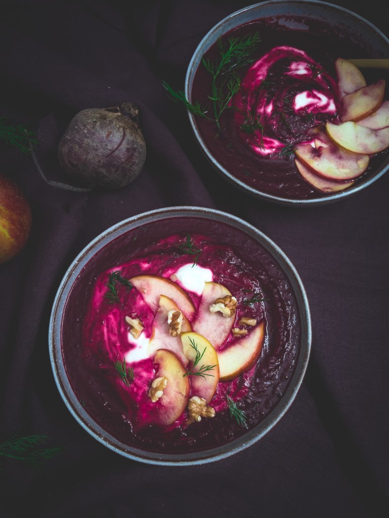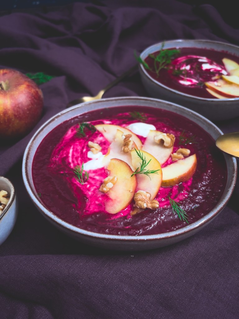 Im Gegensatz zum letzten Oster– und Weihnachtsmenü habe ich heute aus der Reihe raus mal statt eines Desserts eine easy Vorspeise für euch, wo das Auge direkt mitessen will – es gibt heute leckere rote Beete Suppe getoppt mit etwas gebratenem Apfel und Ziegenfrischkäse. Ein Hauch von farblichem Kontrast steuert noch frischer Dill hinzu. Auch ein paar Walnüsse werten das ganze nochmal mehr auf.