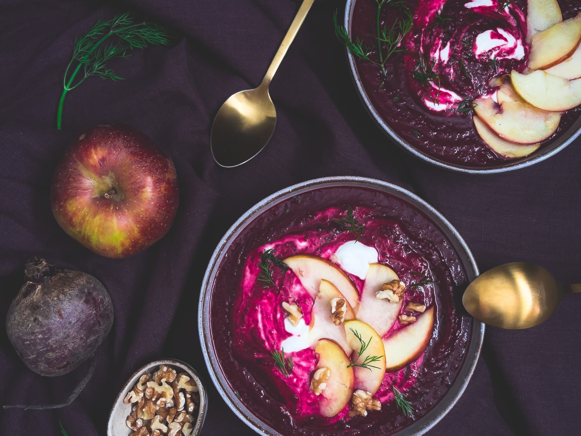 Im Gegensatz zum letzten Oster– und Weihnachtsmenü habe ich heute aus der Reihe raus mal statt eines Desserts eine easy Vorspeise für euch, wo das Auge direkt mitessen will – es gibt heute leckere rote Beete Suppe getoppt mit etwas gebratenem Apfel und Ziegenfrischkäse. Ein Hauch von farblichem Kontrast steuert noch frischer Dill hinzu. Auch ein paar Walnüsse werten das ganze nochmal mehr auf.