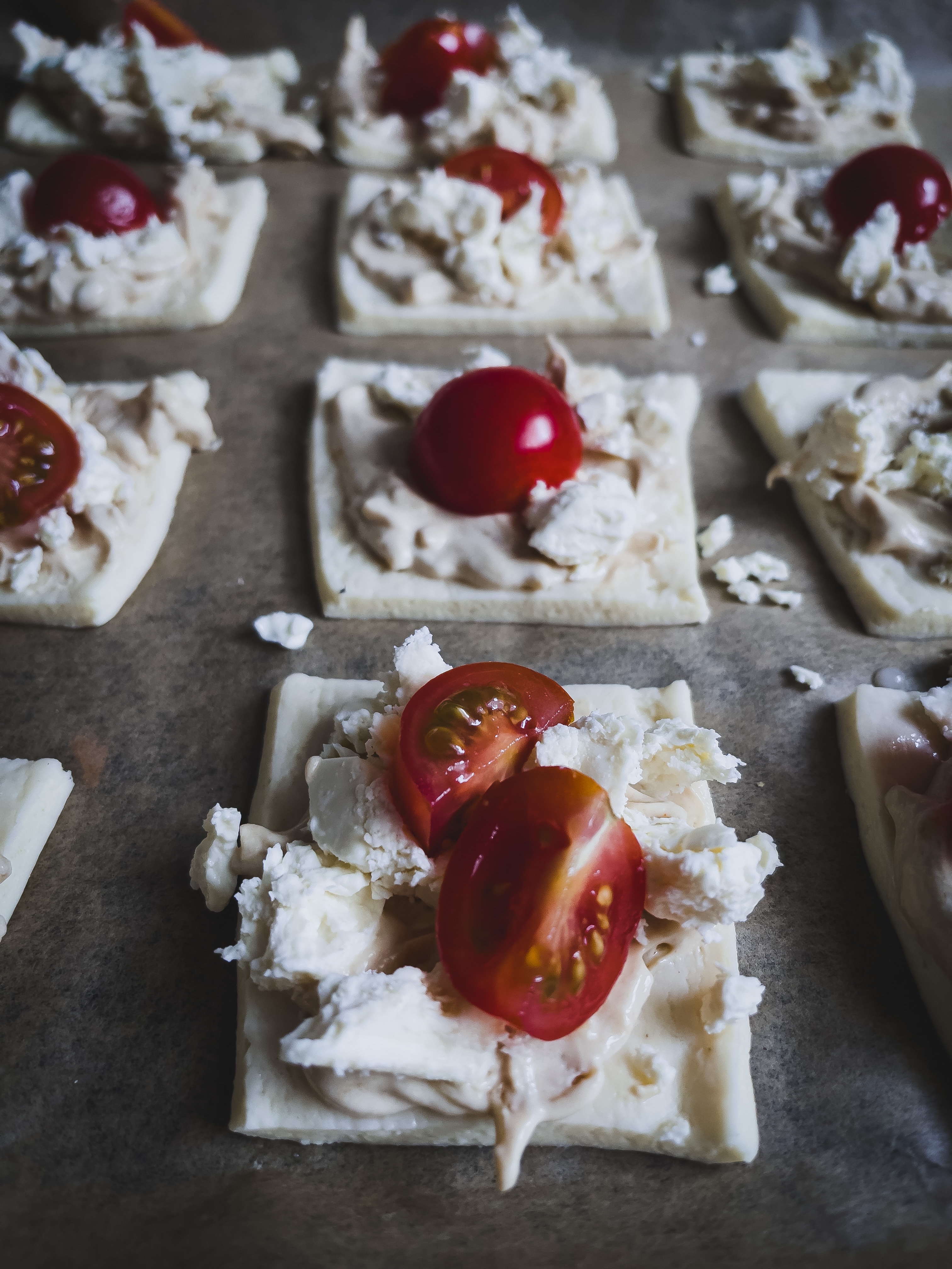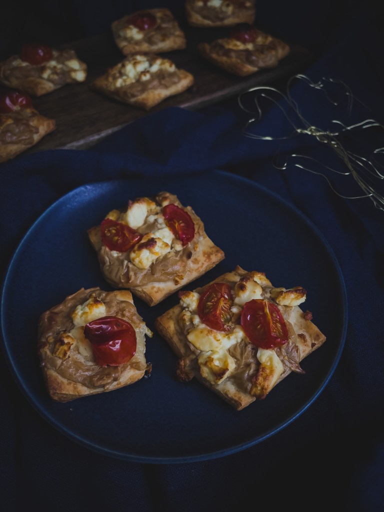 Den Boden vorab schon mal in kleine Rechtecke oder Vierecke schneiden und auf Backpapier verteilen. Den Schmand mit dem Inhalt der Tüte Zwiebelsuppe vermengen und löffelweise auf dem Teig verteilen. Ihr könnt entweder den Schafskäse bereits vorab mit unter die Schmandmasse vermengen oder einfach nach dem Bestreichen des Teigs darauf verteilen. Nach Lust und Laune noch ein paar frische Tomaten drauf verteilen.
