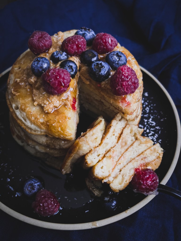 Heute ist meine Oma zwar nicht mehr da und meine Mama hat andere Frühstückspräferenzen, aber ich bin alt / groß genug um mir selbst umwerfendes Frühstück zu zaubern und hab mir meine eigenen Varianten von Kindheitsessen ausgetüftelt. Ich hab heute Apfel Pancakes im Gepäck, die besonders lecker und fluffig und schon fast gesund sind, weil da ja schließlich auch Obst mit drin ist und ich sie am liebsten noch mit frischen Beeren genieße.