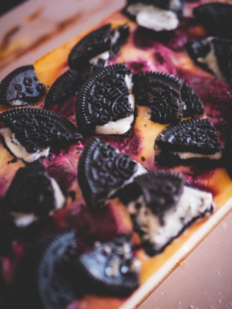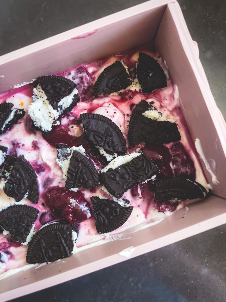 Die Kirschen auf den Teig geben und leicht unterrühren. Oreos in kleinere Stücke brechen und auf dem Teig verteilen.