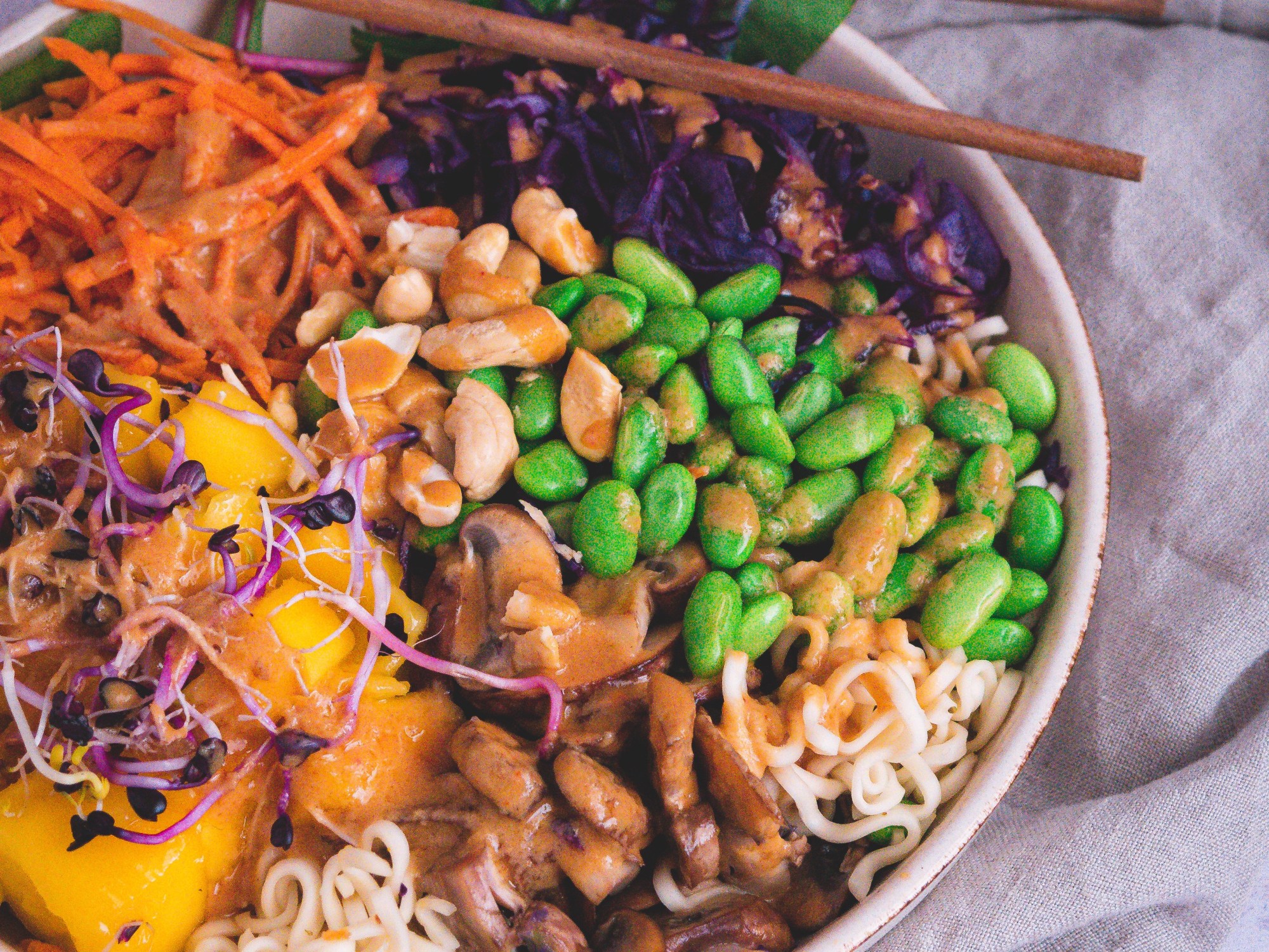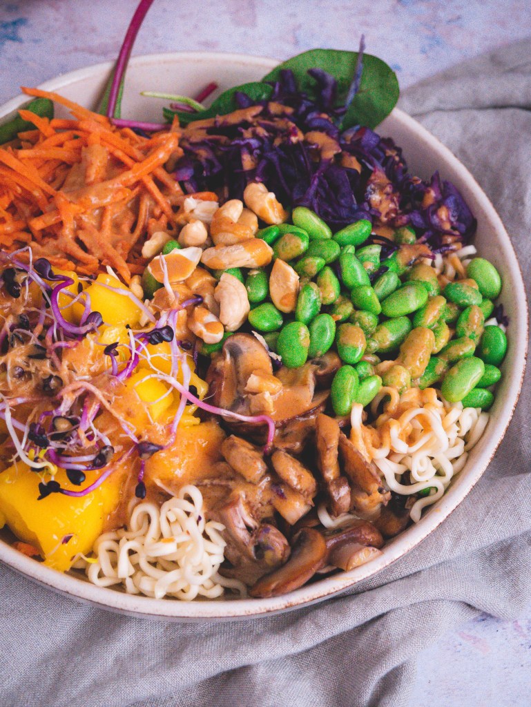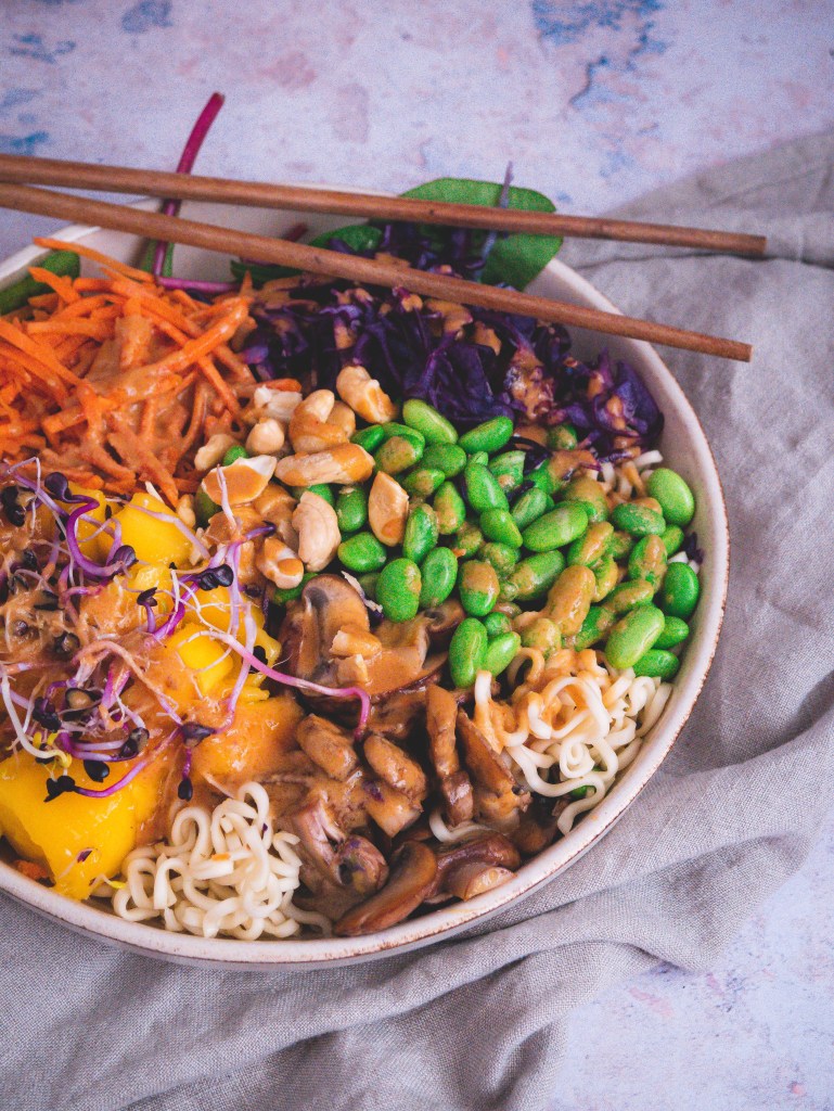 - Bunte Zutaten nach Wahl, zB Mango, Edamame, Rotkohl, Gebratene Champignons, Möhren