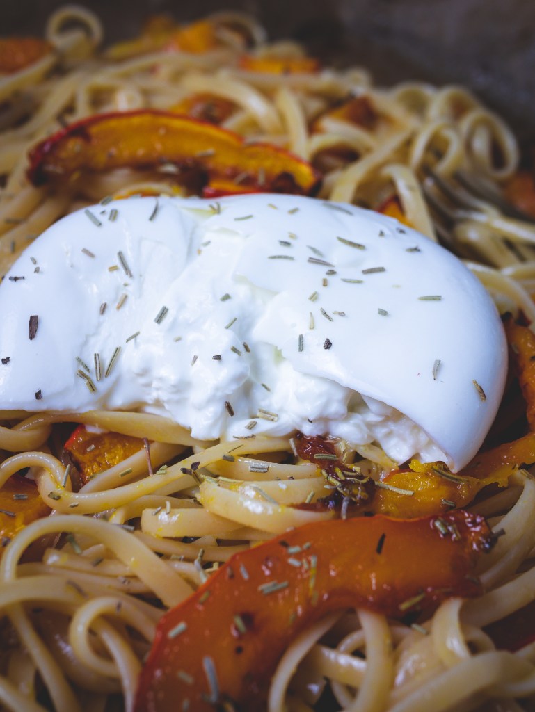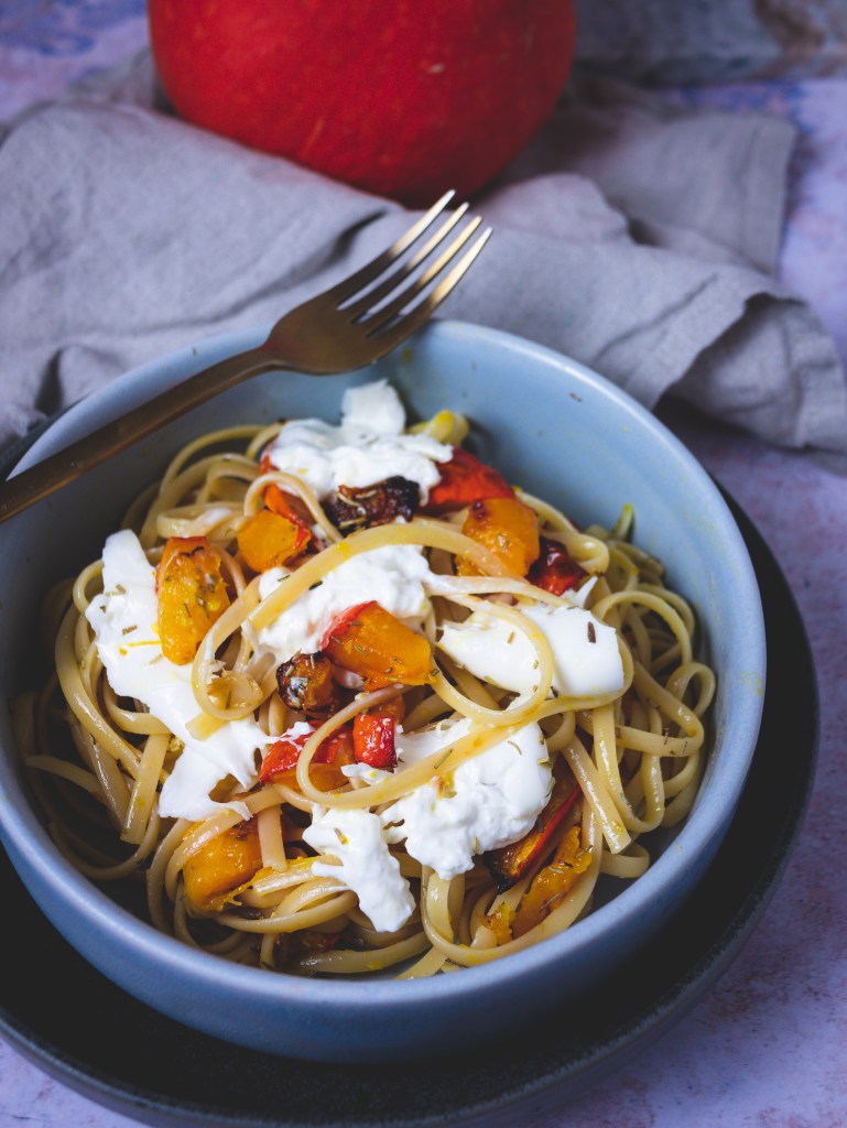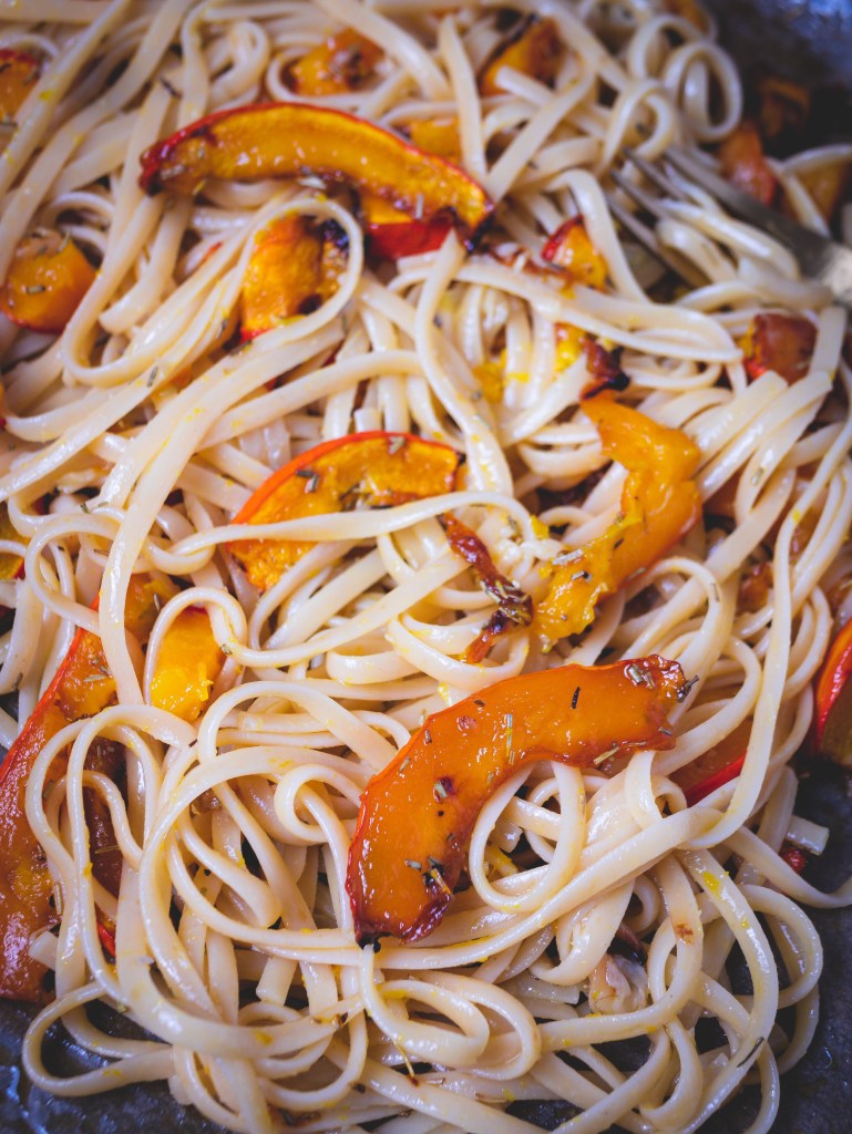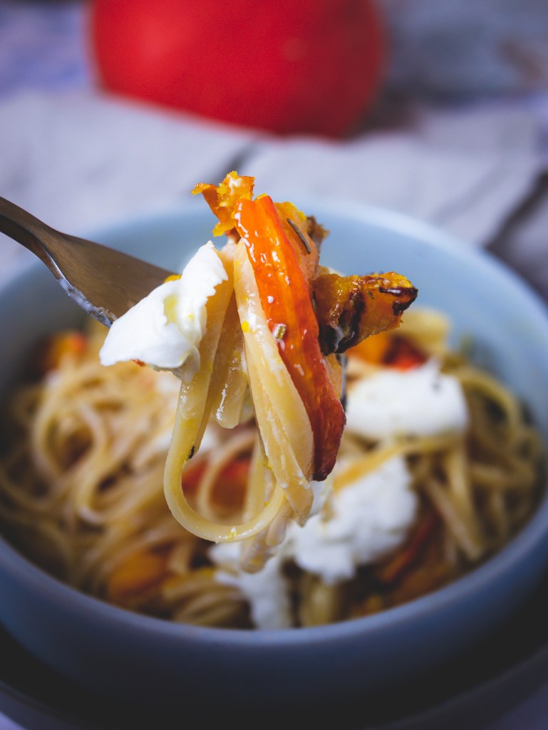 Der Kürbis schmeckt einfach umwerfend lecker, wenn man ihn im Ofen mit etwas gutem Olivenöl und Ahornsirup karamellisiert – und viel Knoblauch ist eh immer gut!