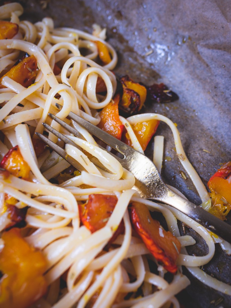 Pasta nach Packungsanweisung al dente kochen. Knoblauch aus der Schale drücken und mit einer Gabel klein matschen. Pasta vorsichtig unter zerdrückten Knoblauch und Kürbis mischen – macht das auf jeden Fall auf dem Blech, weil so der ganze köstliche Saft aus Öl und Ahornsirup an den Nudeln landet – traumhaft!